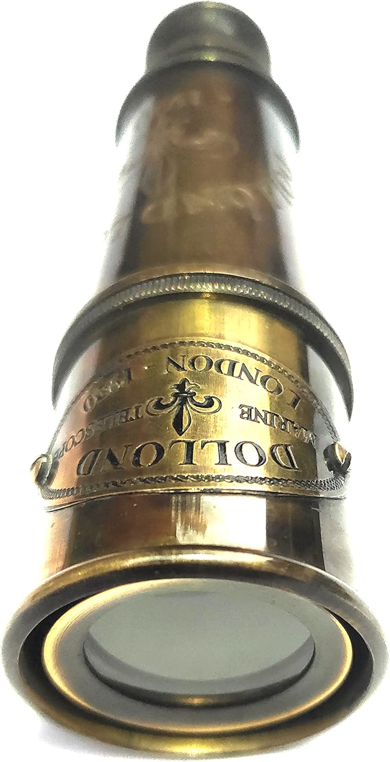 This Marine Handheld Telescope is great for any number of outdoor pursuits such as Hunting, Shooting, Bird Watching or Role Playing. This spyglass has excellent optics for real viewing and would make a wonderful usable nautical decor in any office, boat or home or gifting to your loved ones. This pirate spyglass replica has a sliding sunshade cover, which pulls out to reduce glare in bright light. This telescope uses push-and-pull mechanism to focus distant objects. You need to Pull it out completely and slowly push the barrel inside, while looking through the telescope, till the desired object becomes clear. The spyglass is made of Brass ; Dimension : 4.5 x 4.5 x 40cm (1.77 x 1.77 x 16 inches). Visit our Store SIFAAT WORLD for more other wonderful items.