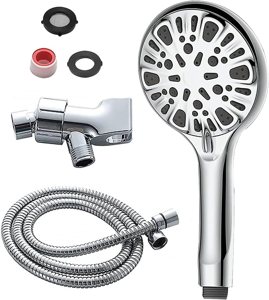 This is the fullest and easiest to use shower kit! Features: 1.Excellent performance to fix the house water pipe line with low water pressure problem ; 2.Full Brushed Nickel: Full brushed nickel handheld showerhead with stainless steel hose makes the shower head set lightweight, high strength and rustproof, resists fingerprints and water spots, the perfect choice for a cleaner bathroom. 3.9 Spray Settings Controller: Gently rotating the slid bar on the handheld showerhead panel can switch the modes easily, each mode brings you and your families the best shower experience 4.Self cleaning Silicone Jet Nozzles: The shower head has 4.5 inch panel with 42 self cleaning silicone nozzles and preventing lime buildup. A low maintenance shower head for years. 5.Angle Adjustable Overhead Bracket: Easy to enjoy a more comfortable shower at your desired angle. 6.1/2 IPS US Standard threads size fitting for more than 99 Percent US family shower water supply pipes. Package Includes Handheld Shower Head x 1 60 Inch Stainless Steel Hose x 1 Shower Head Holder x 1 Rubber Washers x 2 Anti leakage Teflon Tape x 1 Easy Installation ; Free Tools 1.Round the teflon tape. 2.Connect the adjustable bracket to the shower arm. Make sure a washer is in the bracket 3.Put the two washers completely into both ends of stainless steel hose. Connect the hose to the bracket outlet and the shower head. 4.Complete the installation. Enjoy your shower.