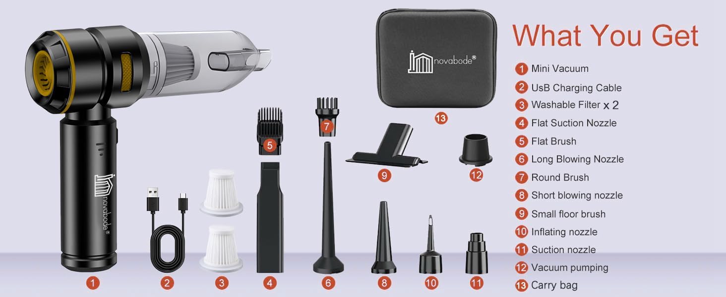 | Included Components | 2 Washable Hepa Filters, Accessory Kit - Floor Brush, Long Flat Nozzle, Long Blowpipe, Short Blowpipe, Small Inflatable Nozzle, Large Inflatable Nozzle, Extractor Nozzle, Brush Set,, Carrier Bag, Handheld Device, Type-C Cable |