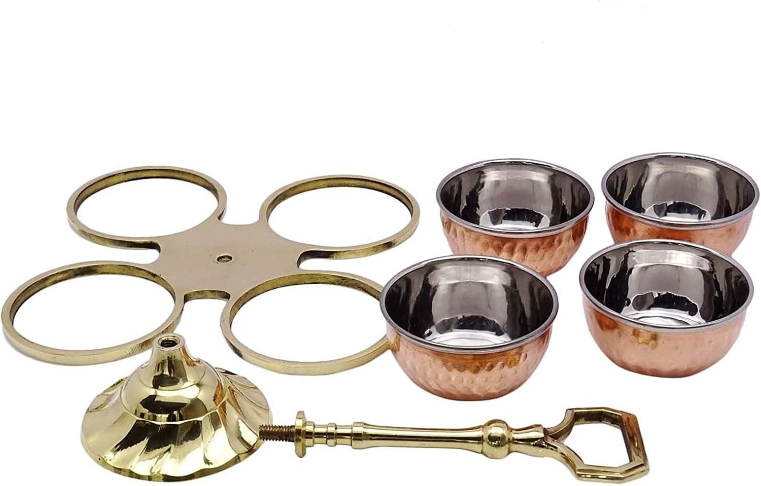 VAKRATUNDA KITCHENWARE products are made of Pure Copper that comes to you directly from the factory. Like a fine wine, the products get Better with age.The Polished Surface starts shiny and Develops a rich patina over time. If you wish to buff fingerprints or scratches from the surface , use a dollop of Brass Polish and Micro Fiber Cloth.This is a condiment or pickle set. This delightful set of pickle dishes or condiments are artisan made in India. Made from copper and stainless steel adds beauty to this condiment set. The set can be used for Pickles, chutneys, sweet and savory sauces. Use the tray separately to serve crackers or after dinner mints. The set can also be used to hold tea lights for a table center. The bowls in this serve ware are joint. The external side of each bowl is made in copper, while the inside is made of stainless steel. The detachable handle is made in brass. For serving chutneys, pickles, vinegar onions to guests to give authentic Indian dining experience. Pickle Set is widely used in restaurants, buffets, households and hotels. It is a perfect match for Indian fine dining experience.