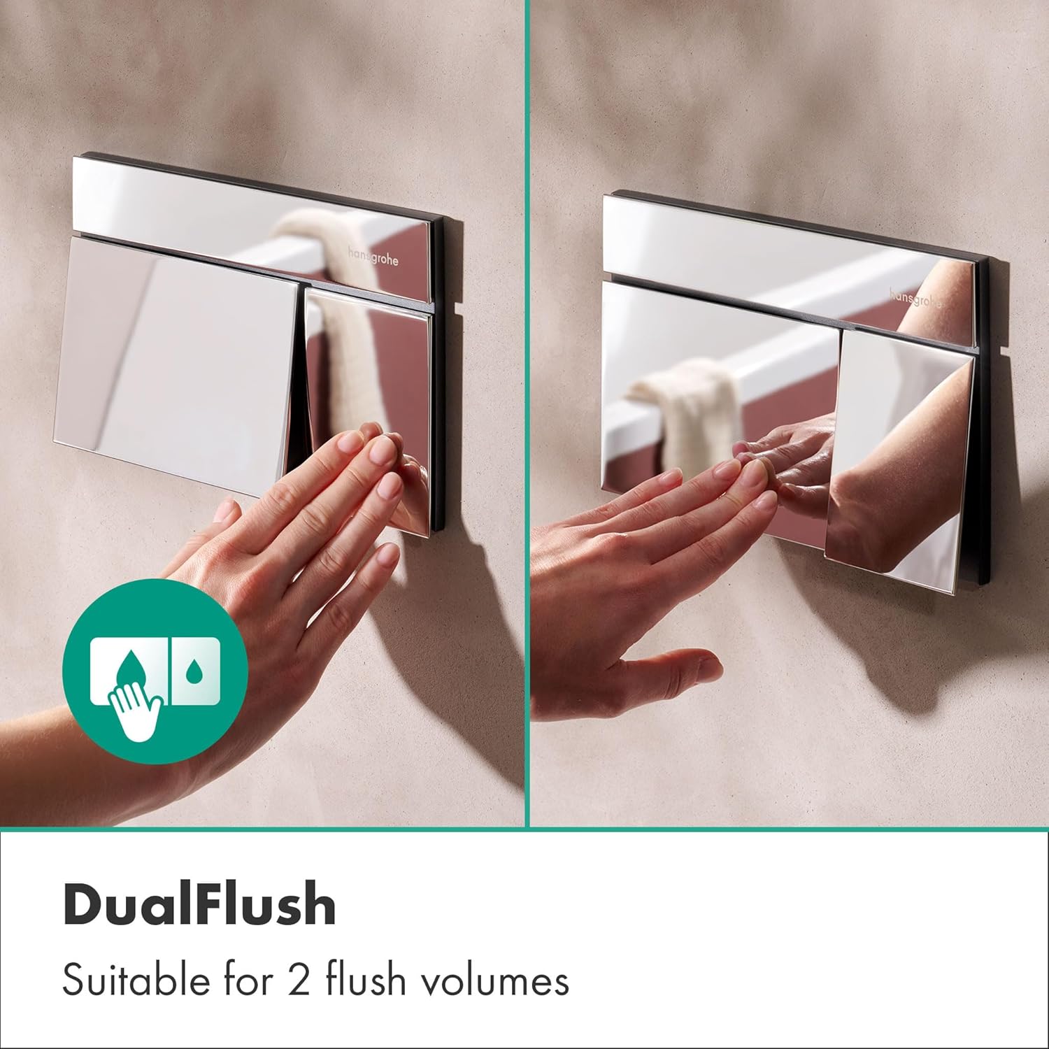 Complete bathroom design with hansgrohe: iFrame Element E push plate (chrome). The hansgrohe iFrame Element E actuator plate is the ideal addition to your bathroom. Matches hansgrohe fittings and showers in bright chrome, it creates a colour-coordinated, harmonious bathroom ambience. Design to feel good Timelessly beautiful: outlasts fast-paced trends and fits perfectly with hansgrohe FinishPlus surfaces High quality: the actuators are made of metal and are particularly durable. Comfortable: thanks to the light switch design, the push plate can also be operated with the elbow 2 flushing: reduced water volume as required if desired. Other features: SECURE CHOICE: Combine with an iFrame universal flush mounted cistern (sold separately) - hansgrohe reliable flush-mounted solution Future-proof: works with classic toilets and modern shower toilets that are universally mounted with hansgrohe iFrame Easy to install without special tools. Brand quality: 5 year voluntary manufacturer's warranty