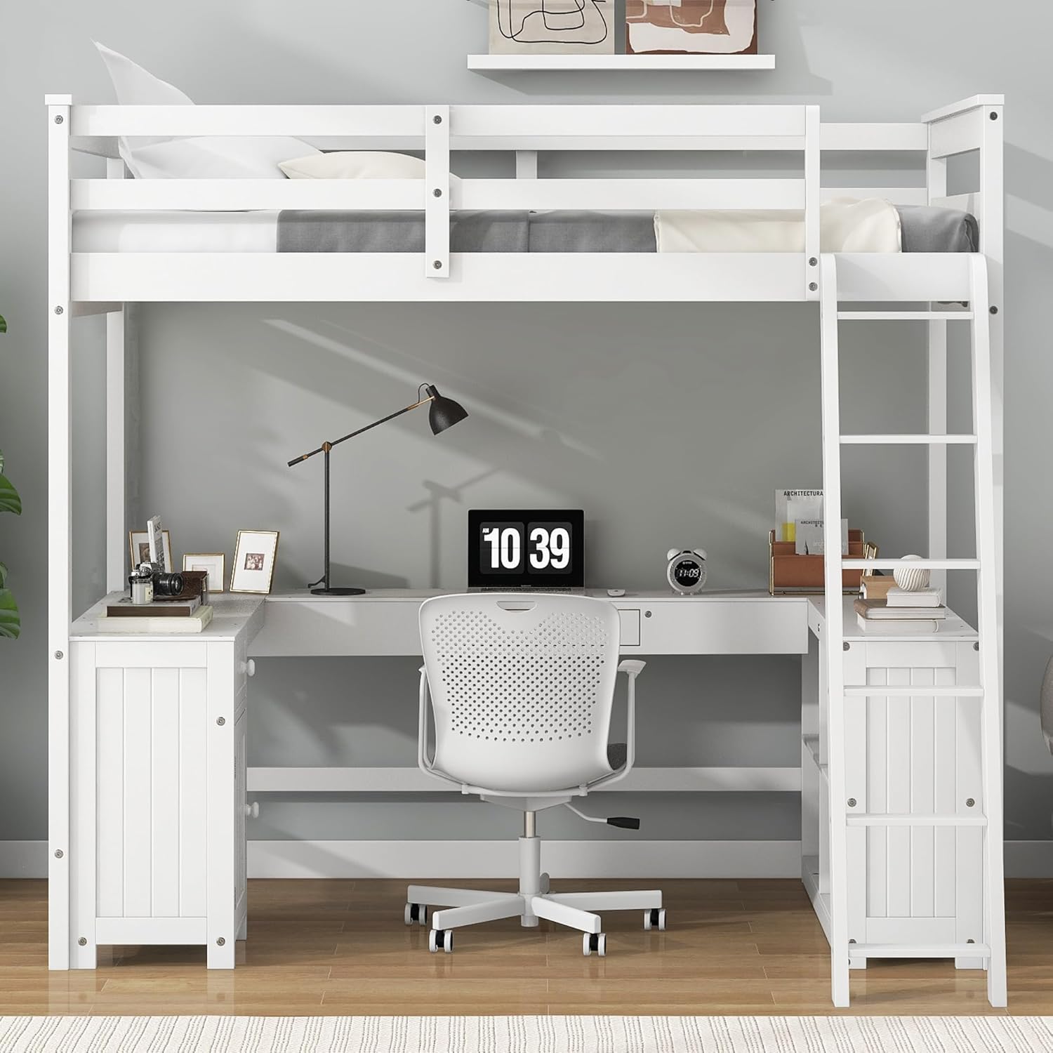 This versatile loft bed can meet your various needs. The storage shelves, cabinet and drawers provide ample storage space. The built-in desk brings convenience to your entertainment or study. White/antique brown finish will fits any home style.Maximize your space and elevate your living experience with this multifunctional loft bed—the ultimate solution for small apartments, guest rooms, or kids’ bedrooms! Material:Pine Wood+MDF Size:Full Color:White/Antique Brown Assembly Required:Yes Overall Product Dimension:77.7''L x 54.4''W x 75.5''H Full Bed:75.3'' x 54.3'' Total Height:75.5'' Overall Product Weight:211lbs Bed Weight Capacity:550lb