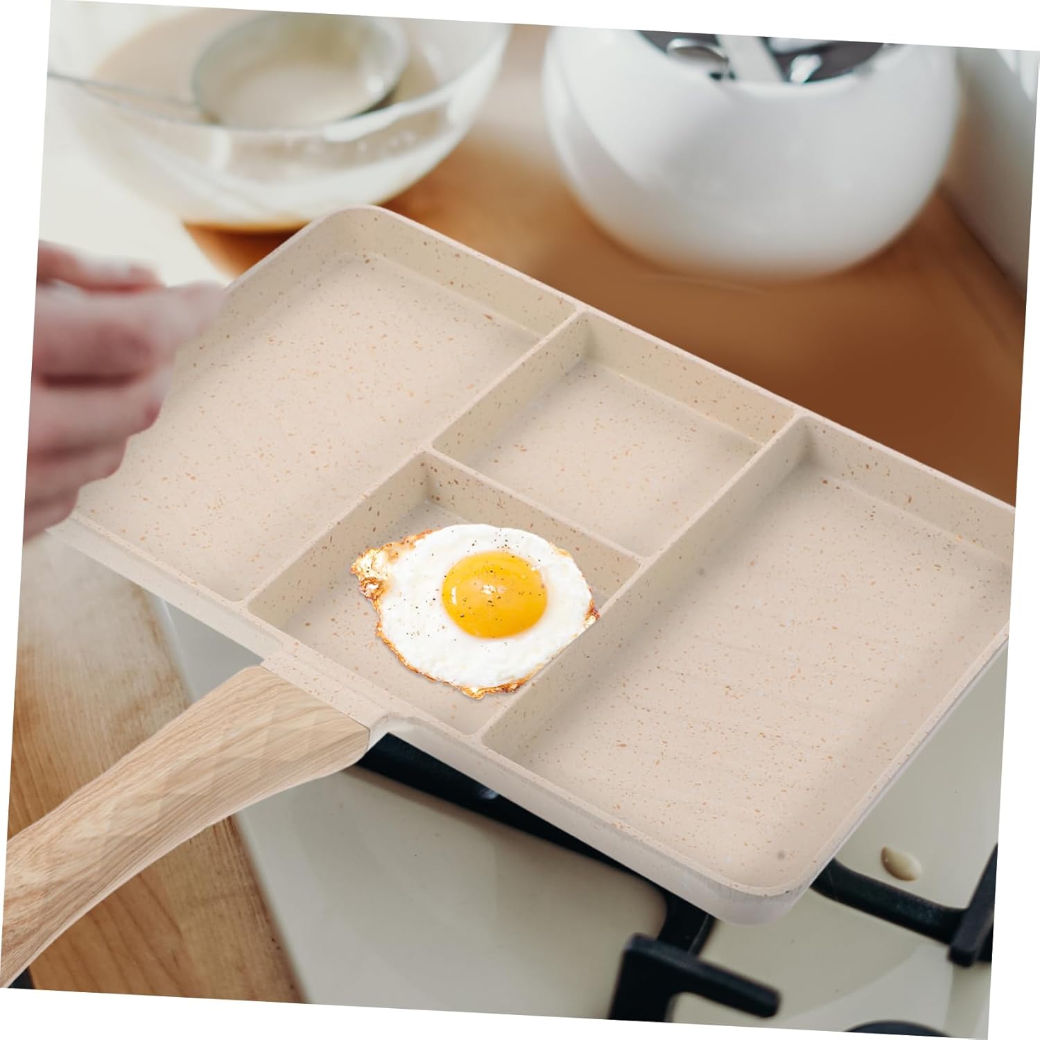 Package Include 1 x Frying Pan Features -Material:Aluminum alloy and wood egg fry pan -Color:Beige nonstick pan -Size:35.00X27.50X2.30cm/13.76X10.81X0.90in pan skillet -Product Info:Maifanshi fried egg pot -Cooking is quicker and easier, requiring only a few simple steps. Division design can cook bacon, eggs, sausage, steak, chicken breast and other ingredients at the same time divided non stick fry pan. -Non stick coating, and healthy, easy to cook, stains are not easy to remain pans for induction stove. -It has the characteristics of hard texture, not easy to deform, good heat transfer effect non stick cooking pan. -The surface is non-sticky, clean and . A great egg and pancake cooking tool small egg pan. -Plural grooves design egg frying pan is suitable for use in home kitchen, restaurant breakfast pan.Goods Informationbreakfast frying pan Wear-resistant bottom design of the pan can heat evenly and save effort.egg pans nonstick The non-stick pan is convenient to use and clean.nonstick frying pan It is perfect for making fried eggs, sandwiches, chicken, egg , etc.egg pan nonstick With creative design, it can keep food from rolling and sliding.frying pan removable handle Frying Pan is made of , and you can rest assured to use