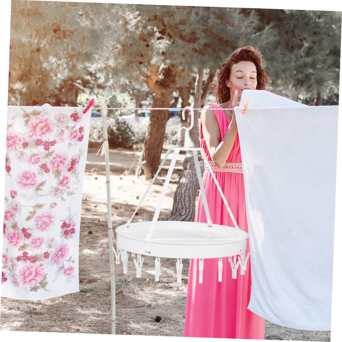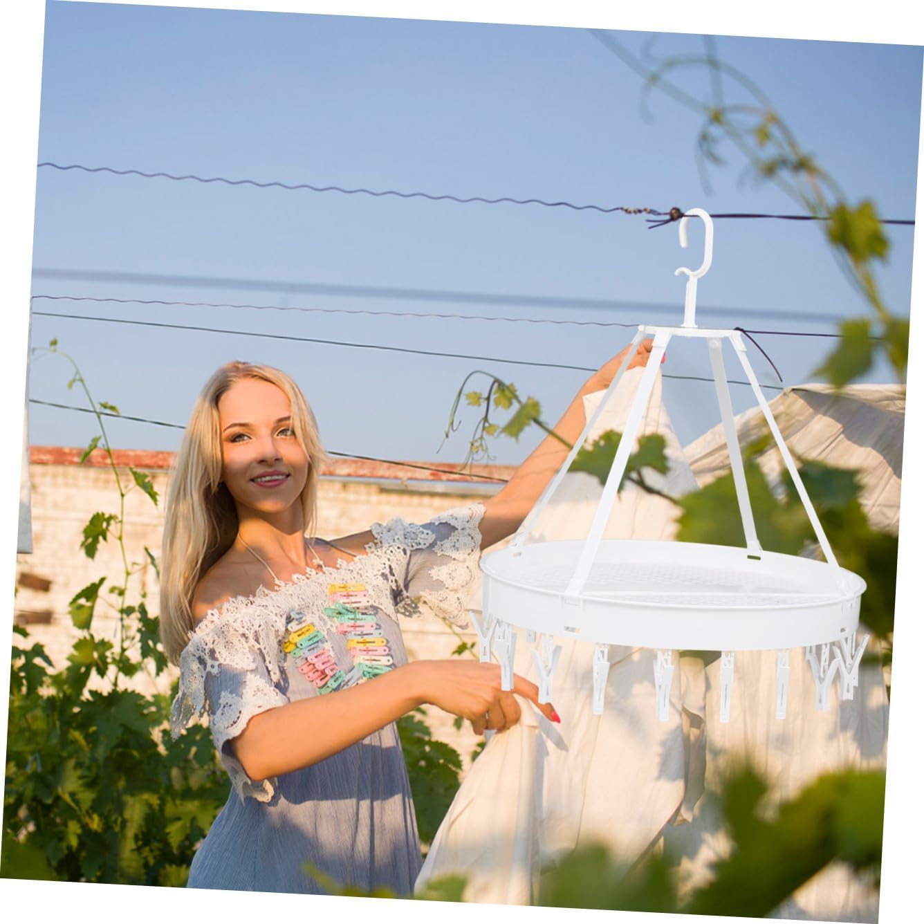 Package List 1 18 x clips 4 x hanging lanyards Characteristics -Product Info:Drying rack -Color: White -Material: PP -Size: 50.00X50.00X40.00cm/19.65X19.65X15.72 in. - You won't face short of hangers and take less space by using this hanger bras drying hook. - Great handy item to organize your closet, the possibilities are endless! towels drying hanger - The clips of the hanger are perfectly spaced to efficiently maximize air flow clothes drying rack. - The lightweight design is perfect for camping, outdoor, business trip, travel or vacation underwear drying hook. - Suitable to hold and dry socks, bras, cloth diapers, towel, underwear, scarf or other small delicate items socks drying hanger.Goods Descriptionsocks drying hook It is easy to hanging on laundry room, wardrobe, closet, shower curtain rod, outdoor clothesline, etc.bras drying hook Multi-functional hanger can be used in various occasions, such as small clothes, clothes, underwear, masks, bras, shorts, handkerchiefs, towels, gloves, socks, scarves, hats, ties, cloth diapers, etc