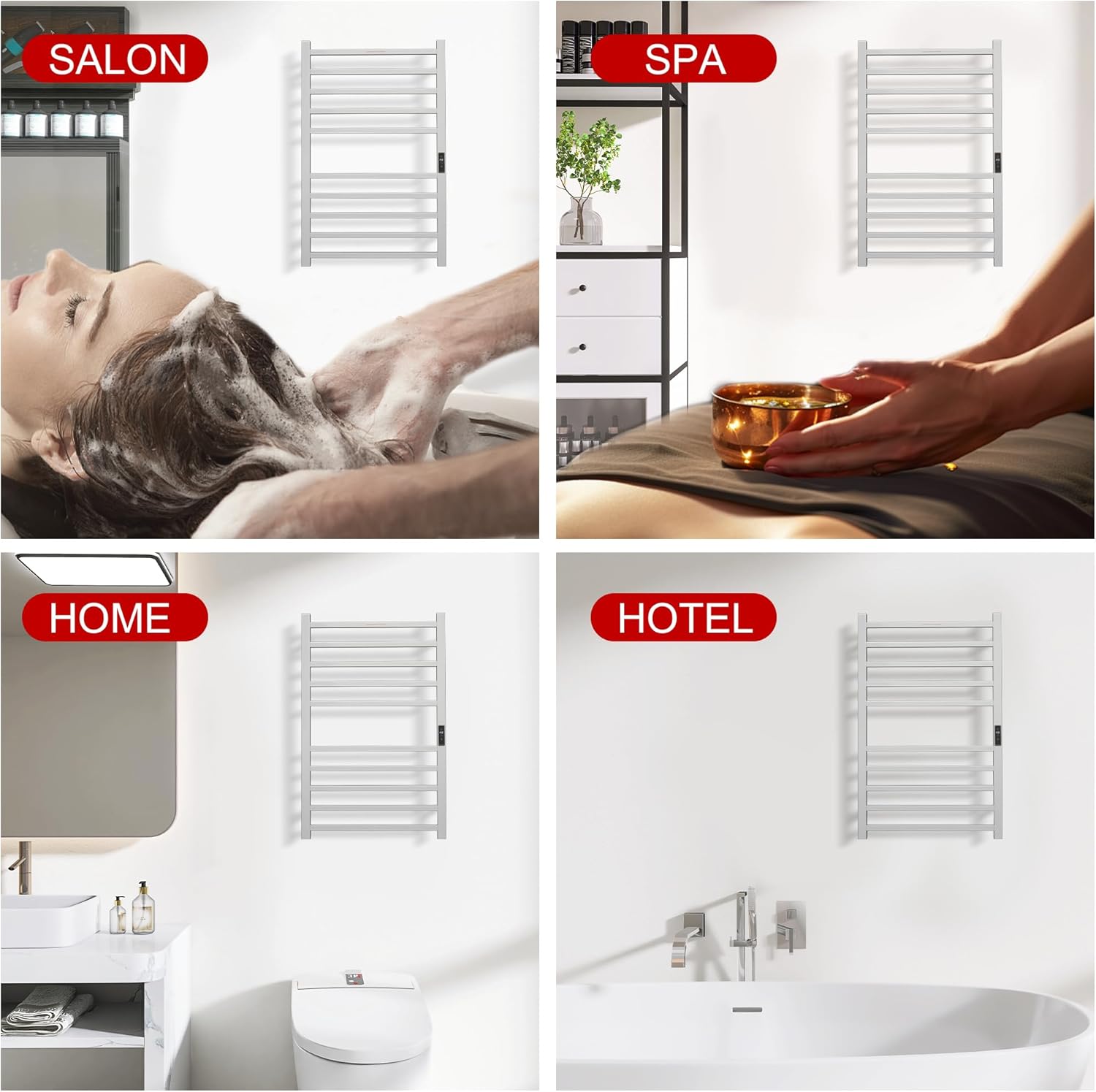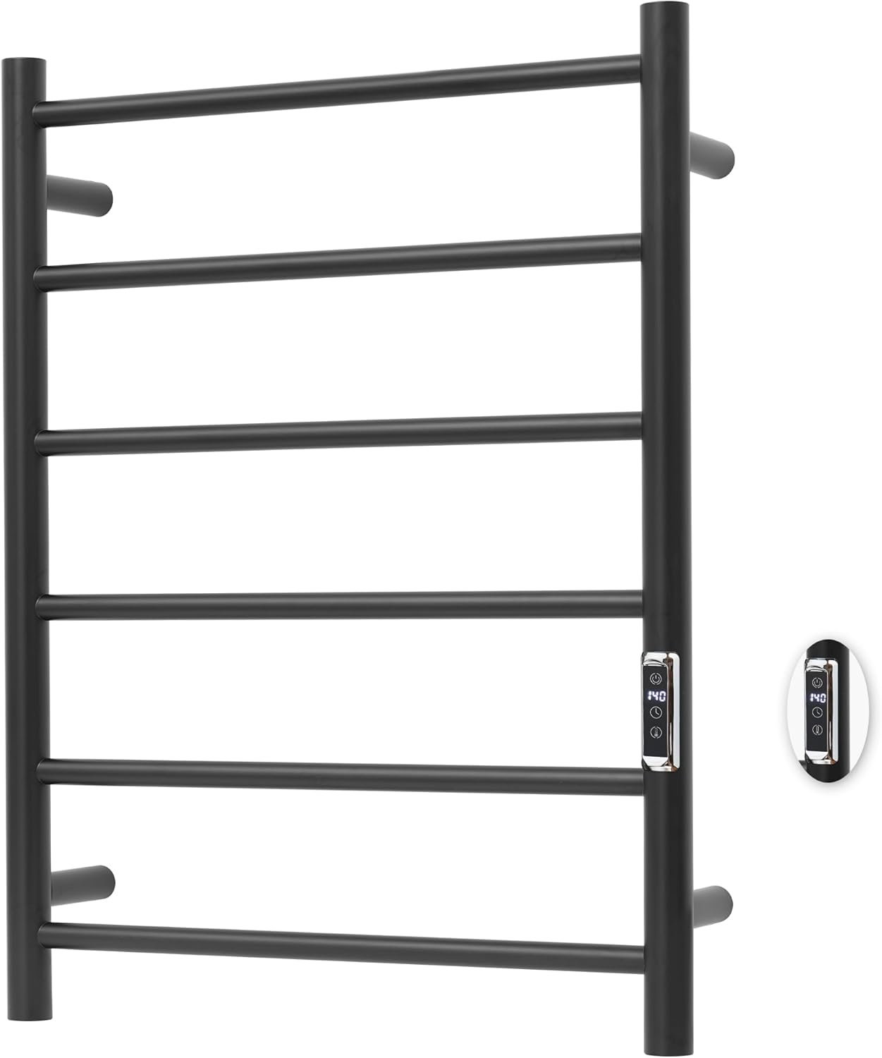 This high-quality heated towel rack is made from durable stainless steel with a sleek brushed finish, offering both corrosion resistance and style. Featuring a modern 10-bar square tube design, it complements any bathroom decor effortlessly. The 300W electric towel warmer heats up quickly, reaching 104°F in just 2 minutes and 158°F in 10 minutes (based on lab tests at 68°F), ensuring you have a warm and comfortable towel after your shower. The intelligent control system includes a built-in timer (1-8 hours, in 1-hour increments) and adjustable temperature (100°F-160°F, in 10°F increments), allowing for customizable heating that saves energy and suits your daily needs. Installation is simple with all the necessary hardware and instructions provided, and hardwiring accessories are available separately for alternative installation options. UL-certified for safety, this towel warmer includes overheating protection and an IPX4 waterproof rating, ensuring full water resistance and eliminating potential safety hazards. We offer a 3-year warranty for non-man-made damage, giving you peace of mind. If you have any questions, our professional support team is here to assist you.