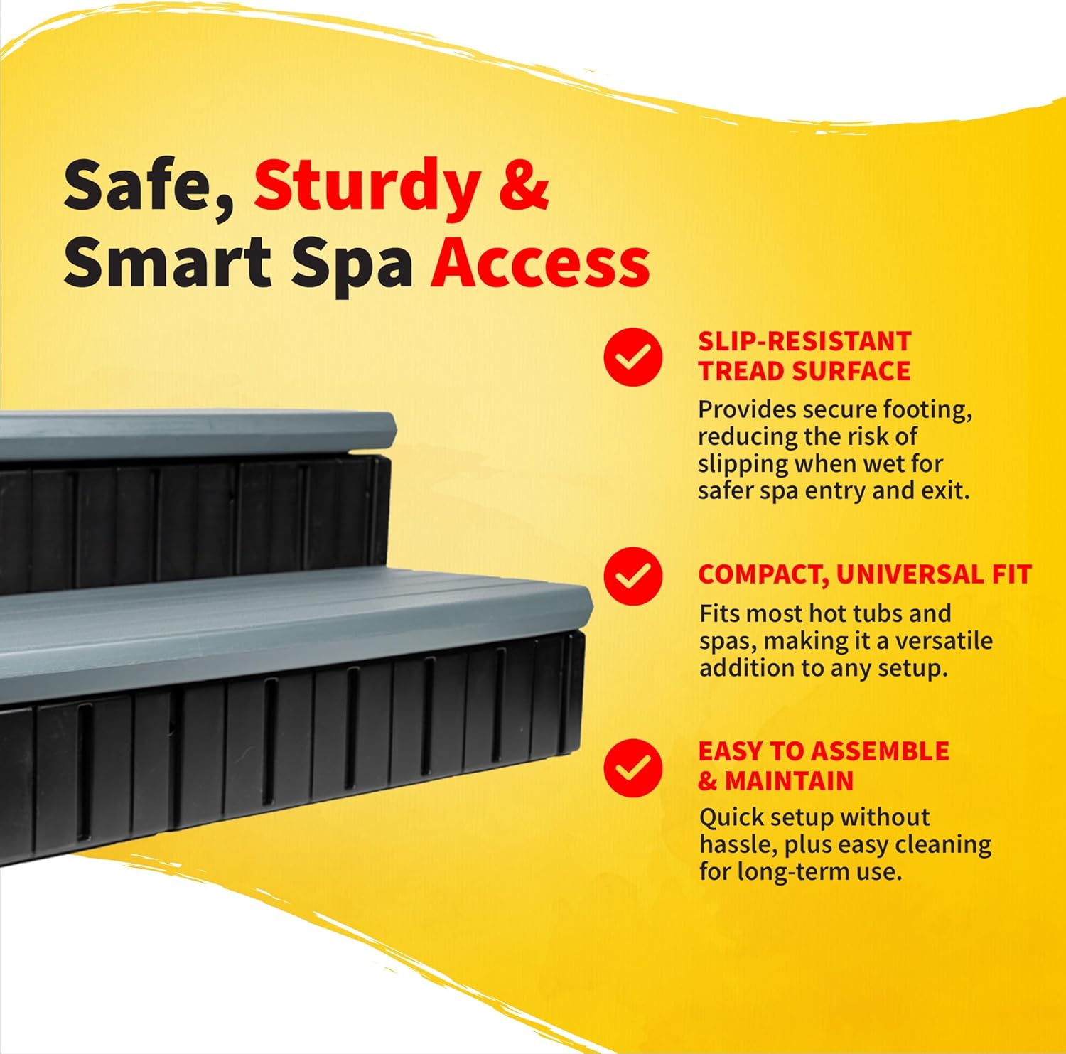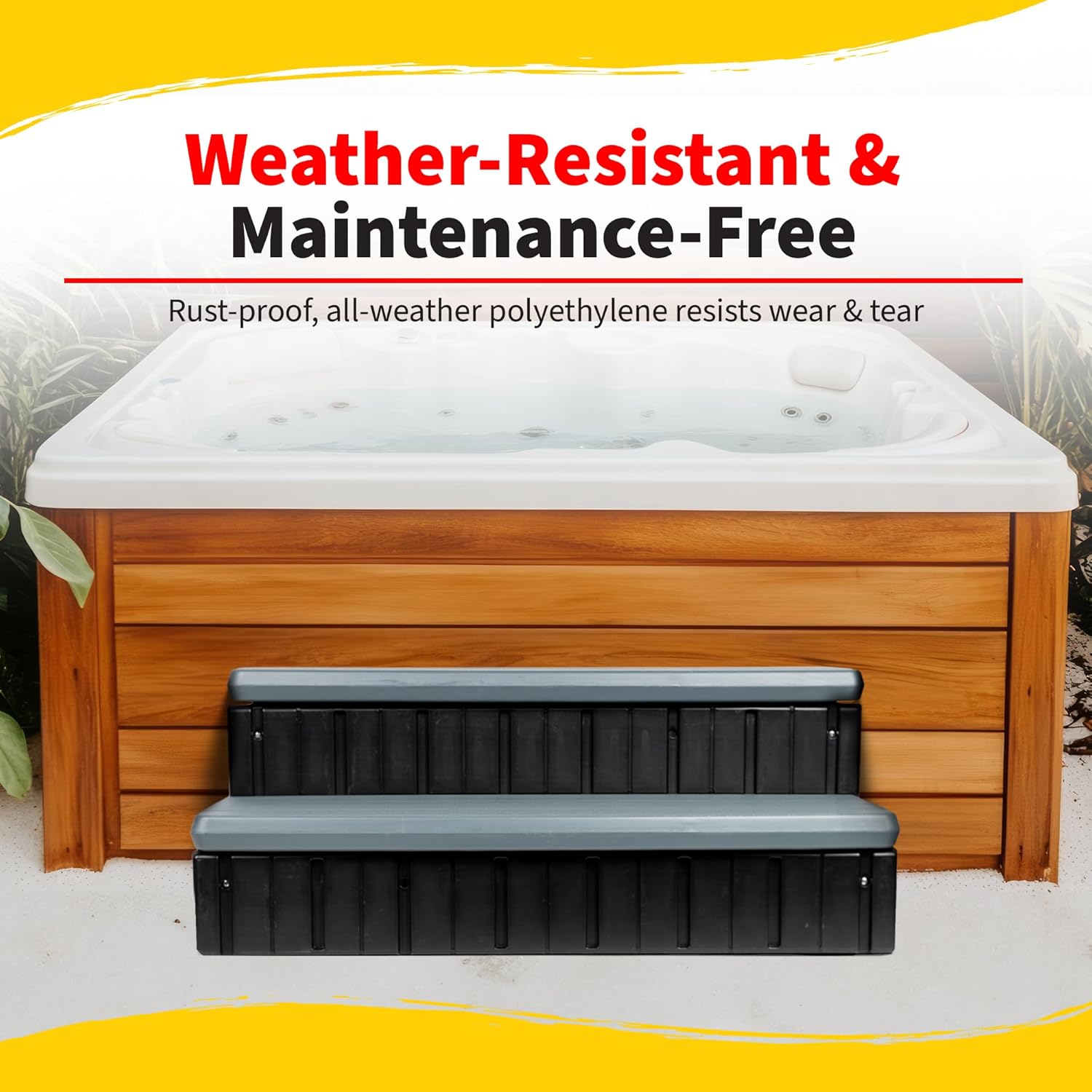 Enhance your hot tub experience with the HeatWave Spa Step with Storage, a versatile and durable solution for easy and safe access to your spa. Designed for convenience, this spa step doubles as stair storage, providing a handy compartment for spa accessories for hot tubs like towels, chemicals, and maintenance tools. Crafted from high-density polyethylene, these plastic steps are built to withstand the elements, ensuring long-lasting durability without rusting, warping, or corroding. The slip-resistant tread provides secure footing, making it easy and safe to step into your best outdoor hot tub, even when wet. With a weight capacity of 300 lbs, these hot tub stairs offer stability and support for users of all ages. Measuring 36-in W x 22.75-in D x 14.5-in H, this 2-step outdoor spa step is designed to fit most hot tubs for 2 people or larger, ensuring a perfect addition to your spa setup. Unlike traditional spa steps with handrails, the HeatWave Spa Step features a hinged top that opens to reveal spacious storage, perfect for hot tub accessories like chemicals, covers, or even a hot tub bench cushion. Whether you need a plastic step for your spa, bathtub, or outdoor tub, this tub step for bathtubs and hot tubs offers the perfect combination of functionality and convenience. With its classic color, these hot tub steps add a stylish touch to your spa area. Easy to assemble and low-maintenance, this hot tub accessory is backed by a 5-year limited warranty, ensuring long-lasting performance. Whether you're looking for spa steps hot tub friendly, or storage for hot tub accessories, the HeatWave Spa Step is the ideal sturdy, slip-resistant, and stylish solution for safe and easy spa entry.