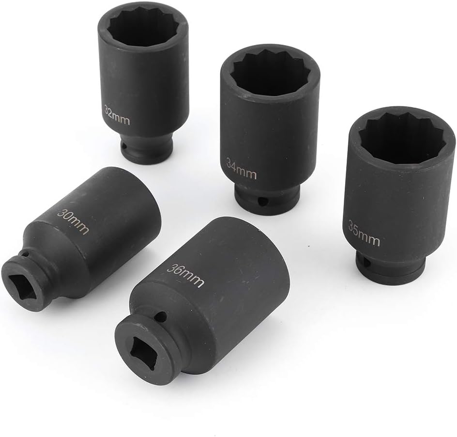 1. [VERSATILE SET] Includes five deep impact sockets in sizes 30mm, 32mm, 34mm, 35mm, and 36mm. 2. [ SOLUTION] Perfect for automotive and various mechanical tasks, providing a range of socket sizes in one set. 3. [PRECISE DRIVE SIZE] Designed for a 1/2-inch drive, suitable for a variety of ratchets and impact tools. 4. [COMPACT DESIGN] Each socket measures approximately 3.1 inches in length for easy handling in tight spaces. 5. [COMPLETE PACKAGE] Comes with a sturdy plastic box for secure storage and transport, ensuring all pieces stay together. Specification: Conditon: 100% Brand New Item Type: Metric Socket Set Material: Chrome Vanadium Steel Color: As Pictures Shown Drive Size: 1/2in Drive Type: 12 Point Length: Approx. 78mm/3.1in Size: 30mm/1.18in, 32mm/1.26in, 34mm/1.34in, 35mm/1.38in, 36mm/1.42in Application: For Use on All Air Powered and Battery Powered Impact Tools / Wrenches, They Can Also Be Used on Breaker Bars / Strong Arms Ratchets and Wrenches packing list: 5 x Socket1 x Plastic Box