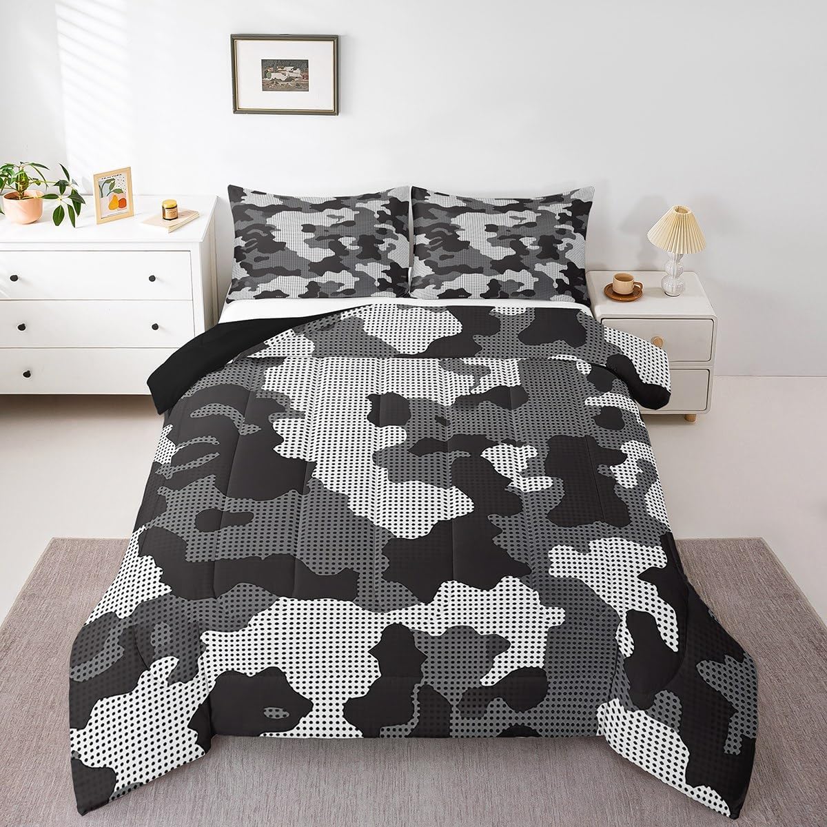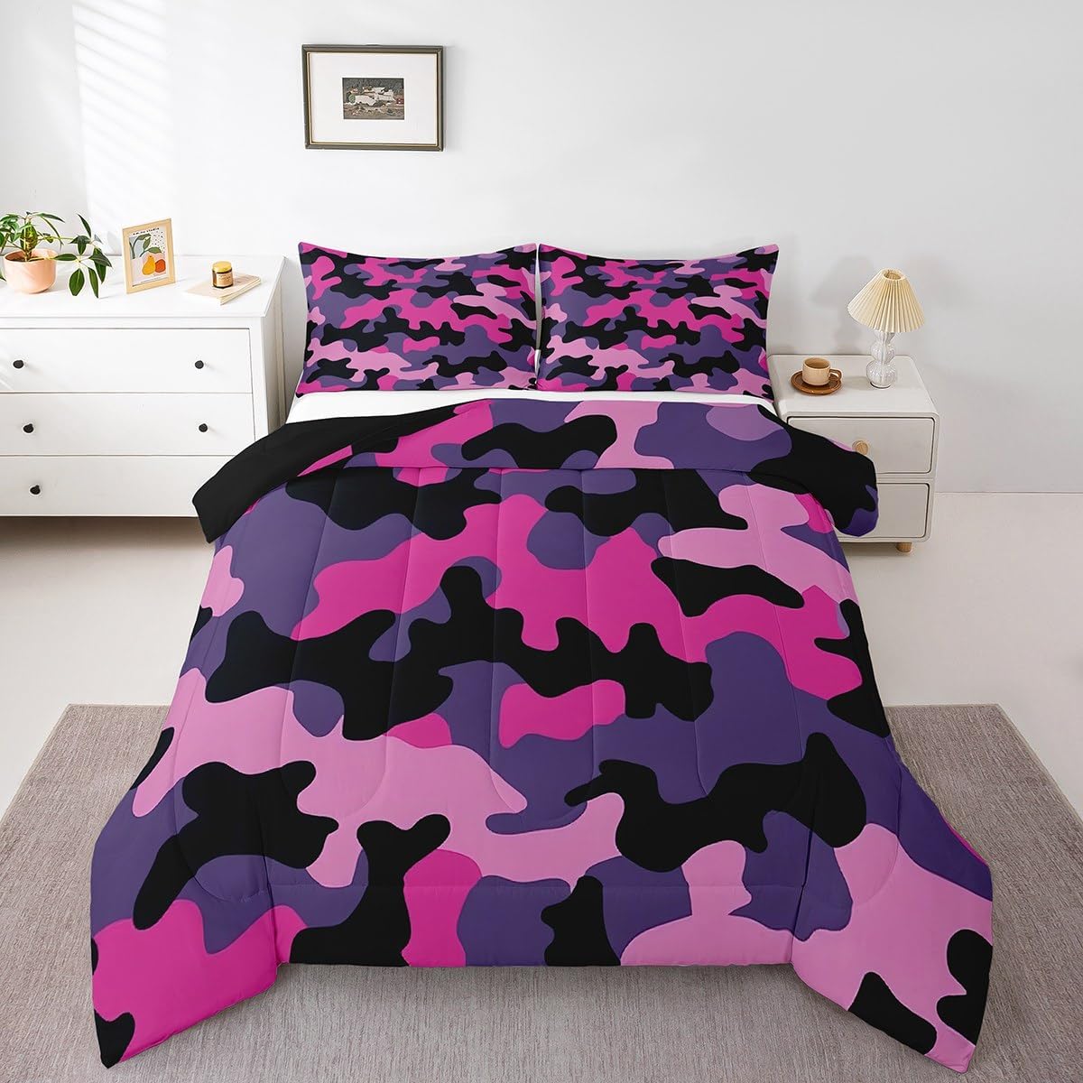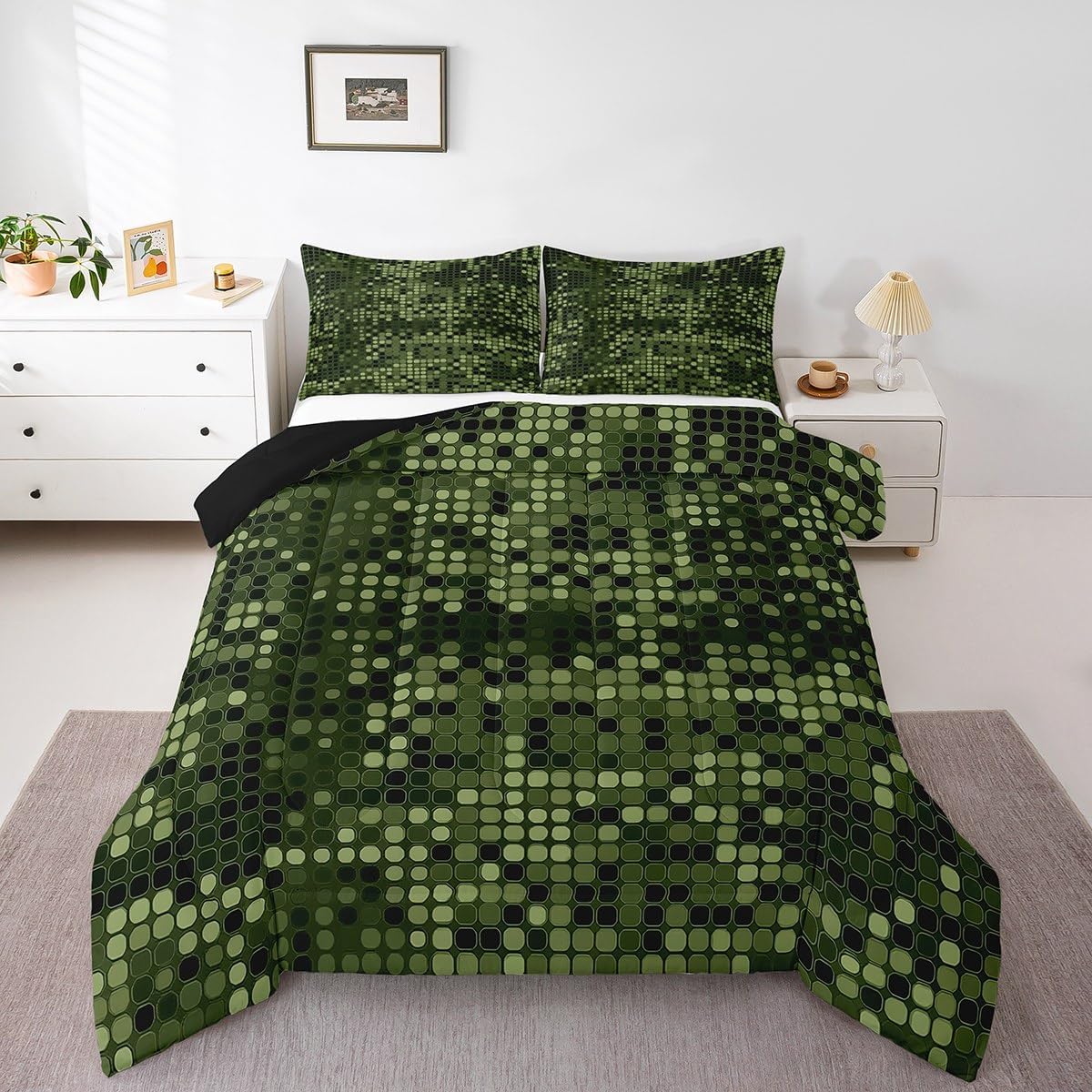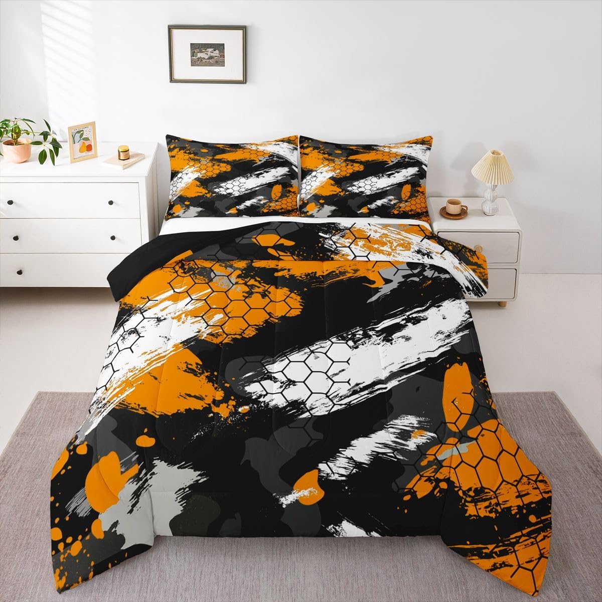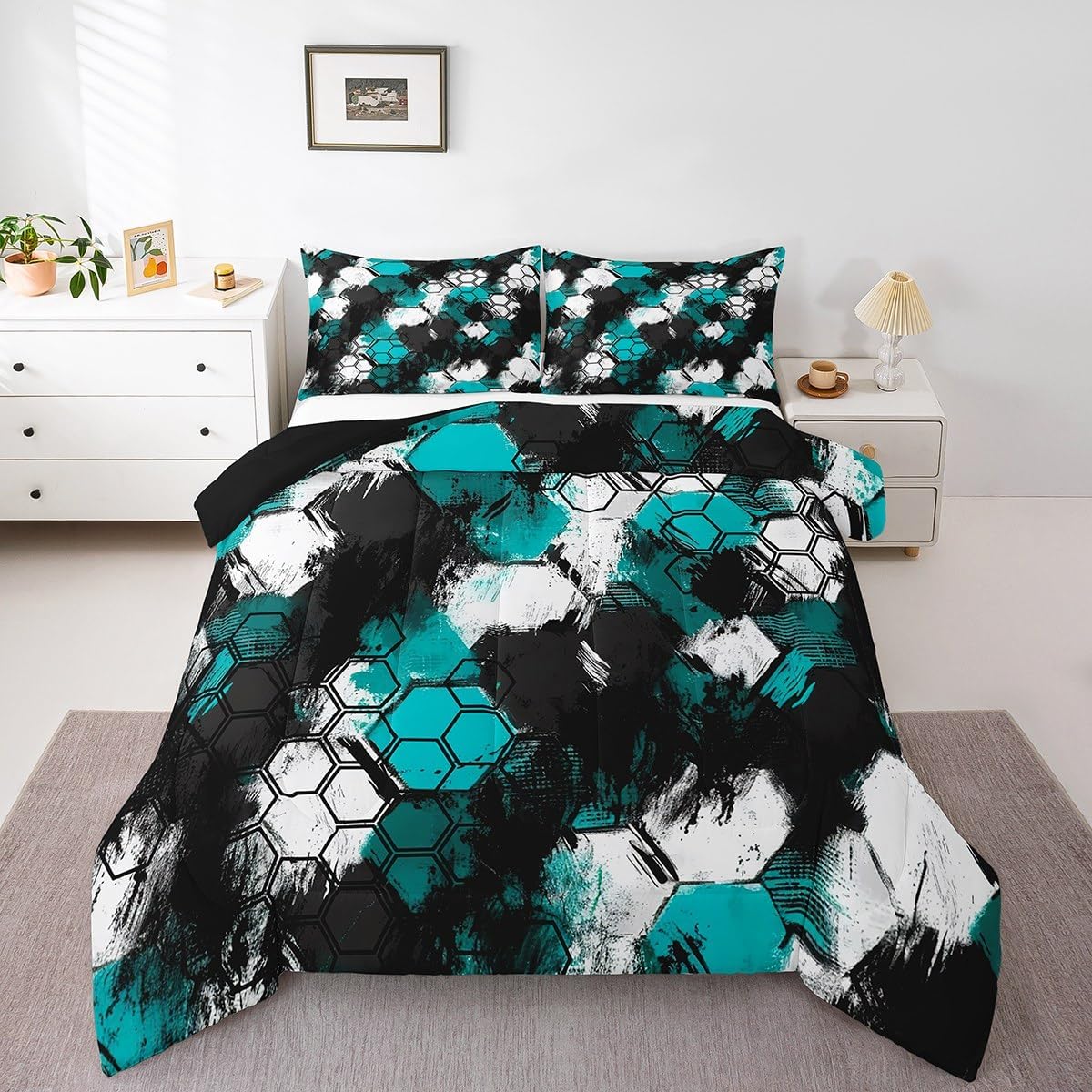 Size Information Twin size: 1 Down Comforter 68"W x 90"L, 1 Quilted Pillowcase 30"W x 20"L. Full size: 1 Down Comforter 79"W x 90"L, 2 Quilted Pillowcases 30"W x 20"L. Queen size: 1 Down Comforter 90"W x 90"L, 2 Quilted Pillowcases 30"W x 20"L. King size: 1 Down Comforter 104"W x 90"L, 2 Quilted Pillowcases 36"W x 20"L. Versatility We have many kinds of styles for you to choose. You can easily find a product that suits the style of your room. The item is not only Suitable for your home, bedroom, guest room, living room, or rv, your families, friends, relatives, boyfriend,girlfriend. Modern Design The luxury aesthetic comforter set is made reactive printing and dyeing process. The pattern is clear, the color is bright, which will not fade after repeated washing. Personalized As a manufacturer of digital printed home textiles, we follow current trends and bring you the latest and stylish home textile products. The item will make the room decorated in exquisite taste. We sincerely hope you will love the bed set.