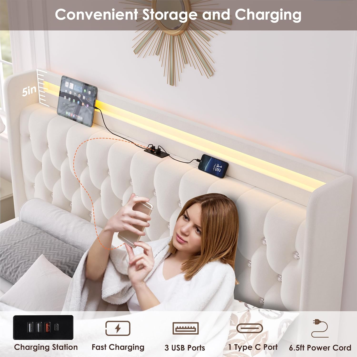 HIFIT King LED Bed Frame with Charging Station and 4 Storage Drawers, Velvet Upholstered Platform Bed with Handcrafted Crystal Button Wingback Headboard, Metal Frame with No Box Spring Needed, Beige