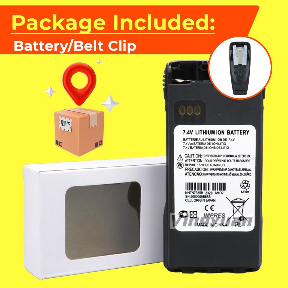 Description:Voltage: 7.4VCapacity: 3350mAhType: Lithium-ion Battery PackWeight: 155g/0.34lb/5.47oz/pcsCompatible with Two Way Radios:For XTS1500 XTS2500 PR1500 MT1500 RadiosCompatible Battery Part Number:NNTN7335A NNTN7335B NTN9858 KBN-9858Fits with MTS2000 Battery Charger BaseFeatures:1. IMPRES Function2. Could Charge with Type-C USB Port ( Note: Not work with Fast Charger Cable)3. Factory packed and 100% New, never been used, Perfect Replacement for Your Original Batteries4. Ultrasonic Sealing Technology, Impact-resistant Design, Dual Protection PCM Short Circuit ProtectionPackage Included:1 x NNTN7335B IMPRES Battery1 X Belt Clip