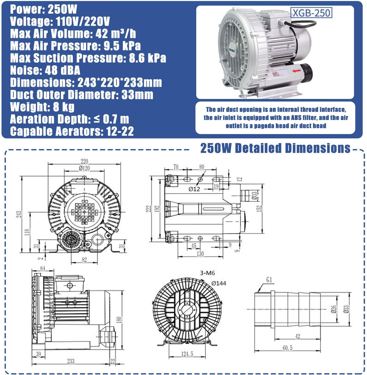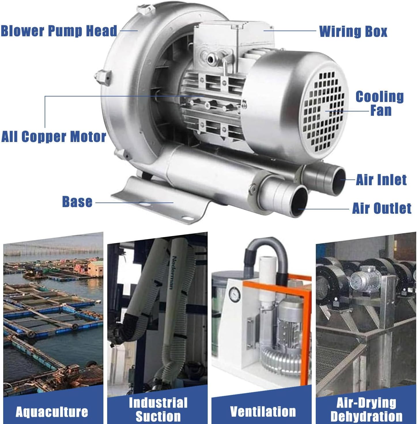 Introducing our high-performance regenerative blower, also known as a vortex blower, specifically engineered for a variety of applications including industrial, commercial, and aquaculture environments. This robust blower is designed to deliver exceptional airflow and suction, making it an ideal choice for aeration systems, pond oxygenation, and septic air pumping.Crafted from durable aviation aluminum, our regenerative blower operates at a voltage of 220V and a frequency of 50Hz. With a single-phase motor speed of 2980 RPM, it can be easily installed either horizontally or vertically to suit your space requirements.Key Specifications- Power Options: Ranging from 120W to 1500W, providing flexibility to meet different operational needs.- Max Air Volume: Up to 240m³/H, ensuring sufficient airflow for various applications.- Max Air Pressure: Achieving pressures up to 27.4 Kpa, this blower excels in performance.- Aeration Water Depth: Suitable for depths of up to 1.2m, making it versatile for different water features.Model Highlights:- 120W Model: Perfect for smaller setups with a max air volume of 27m³/H.- 370W Model: Offers a balanced solution with 80m³/H airflow, ideal for medium-sized ponds. - 1500W Model: The powerhouse of the range, capable of delivering 240m³/H, suitable for extensive aeration needs.Our regenerative blower not only enhances water quality and oxygen levels but also boosts the efficiency of your systems. Whether you're managing a large aquaculture operation or a small decorative pond, this blower provides reliable performance and energy efficiency. Elevate your aeration solutions with a product designed for durability and effectiveness. Experience the difference!