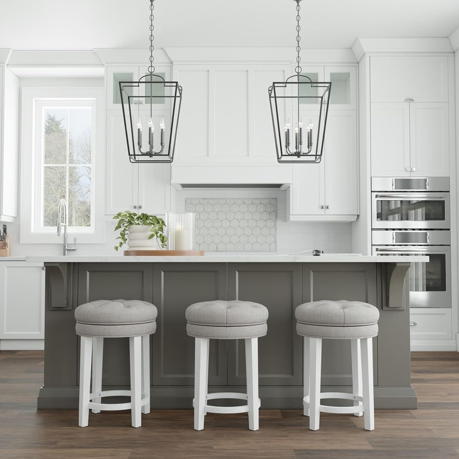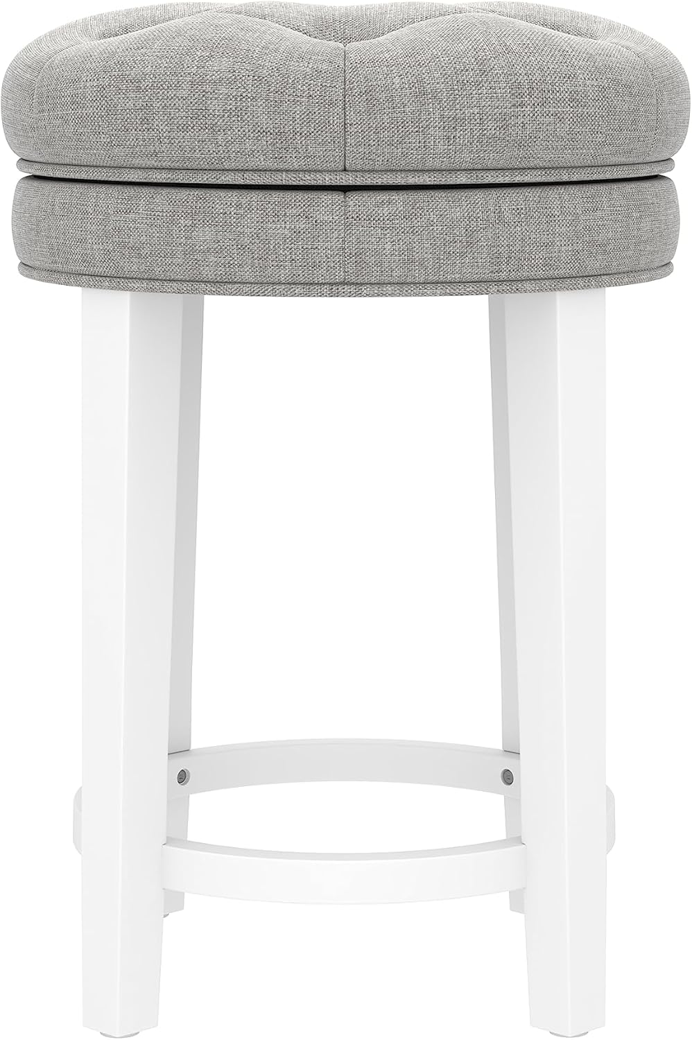 With its clean, classic lines and button-tufted upholstery, this counter height stool shines in the casual transitional style. The streamlined silhouette, tufting and welting around the seat and then again around the base combine to create an overall neat and polished aesthetic. The 360-degree swivel seat is upholstered in a linen gray fabric, and the wood frame has a classic white wire brush finish. The perfect seating option for your kitchen or dining area. Assembly required.