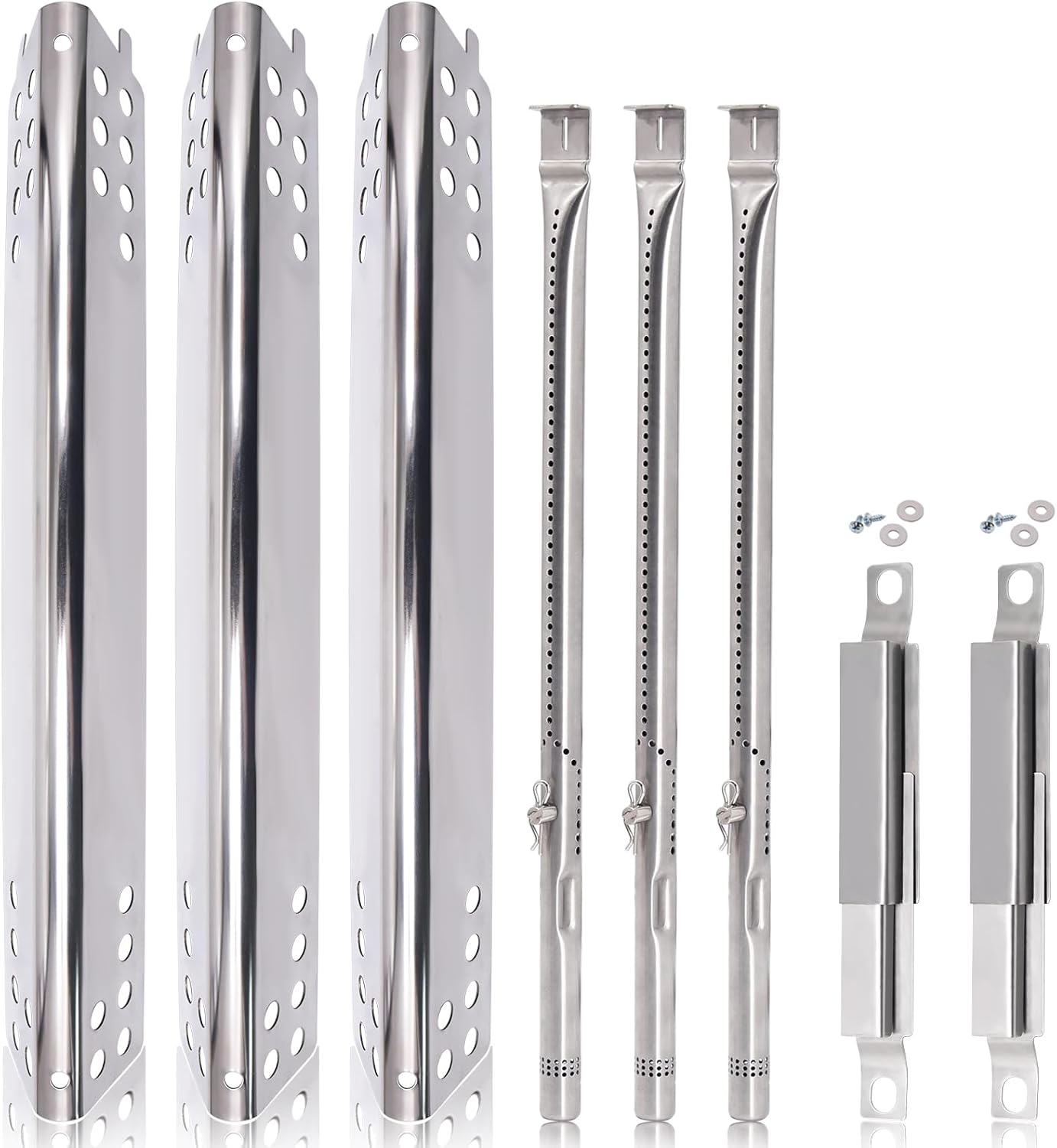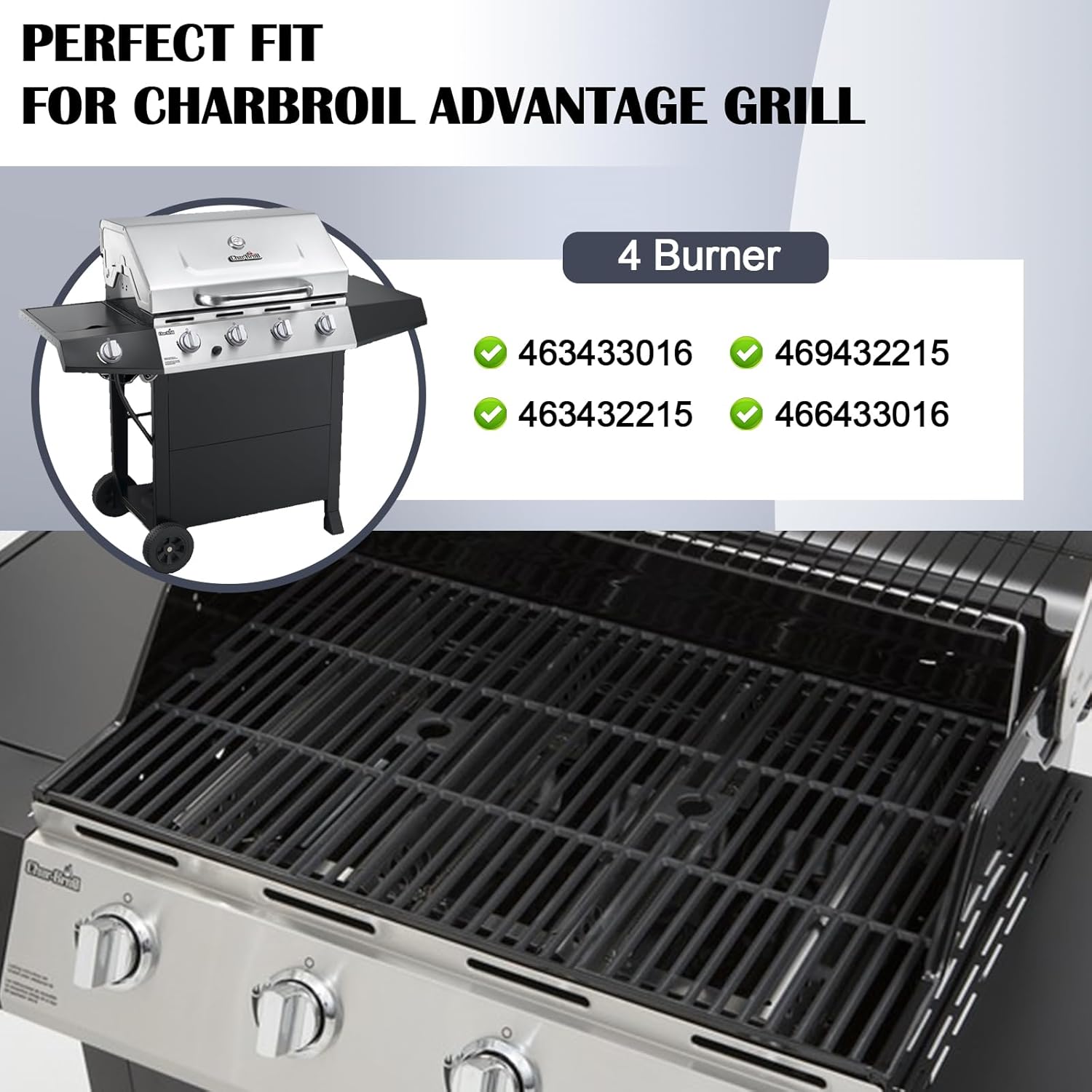 SPECIFICATION★ Burner Dimension: 14 3/8" x 5/8", Material: Stainless steel.★ Heat Plates Dimension: 15 1/8" X 2", Material: Stainless Steel.★ Carry Over tube: Adjust from 5 to 9 inch, Material: Stainless steel.★ Grill Grates: 16 7/8'' x 9 5/16" Each, 16 7/8'' x 27 15/16" for 3 Pcs Total, Material: Matte Cast Iron;★ Package Includes: 3pcs grill grates, 4pcs heat plates, 4pcs grill burner tubes, 4Pcs Ignitors, 3pcs Carryover Tube.Grill Replacement Parts for【Fits Charbroil 4 Burner Grills 】463433016, 469432215, 463432215, 466433016.