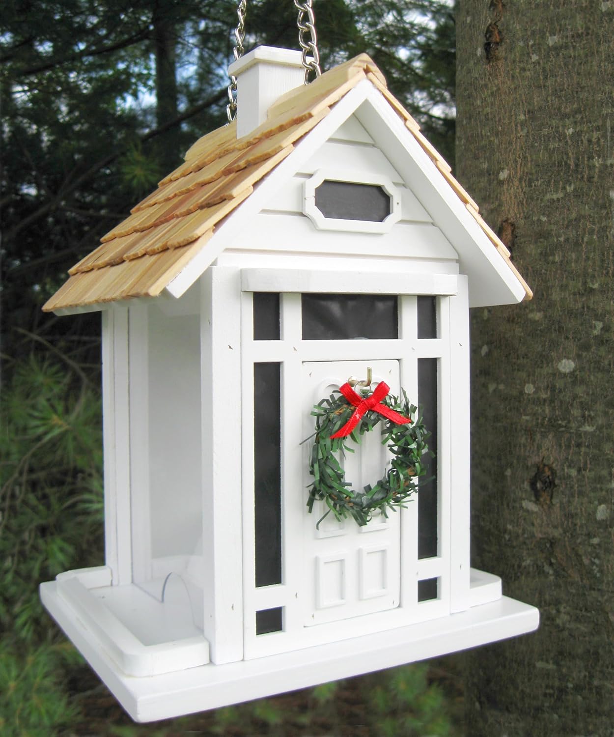 Holiday visitors of both the human and feathered varieties are sure to enjoy the Christmas Cottage Birdfeeder. Our fully functional bird feeder will fit right into any yuletide backyard. Top lifts up to expose ample cavity for seed. Features a removable wreath. Topped off with a pine roof. Item Dimensions: 10" H X 7" W X 6" D.