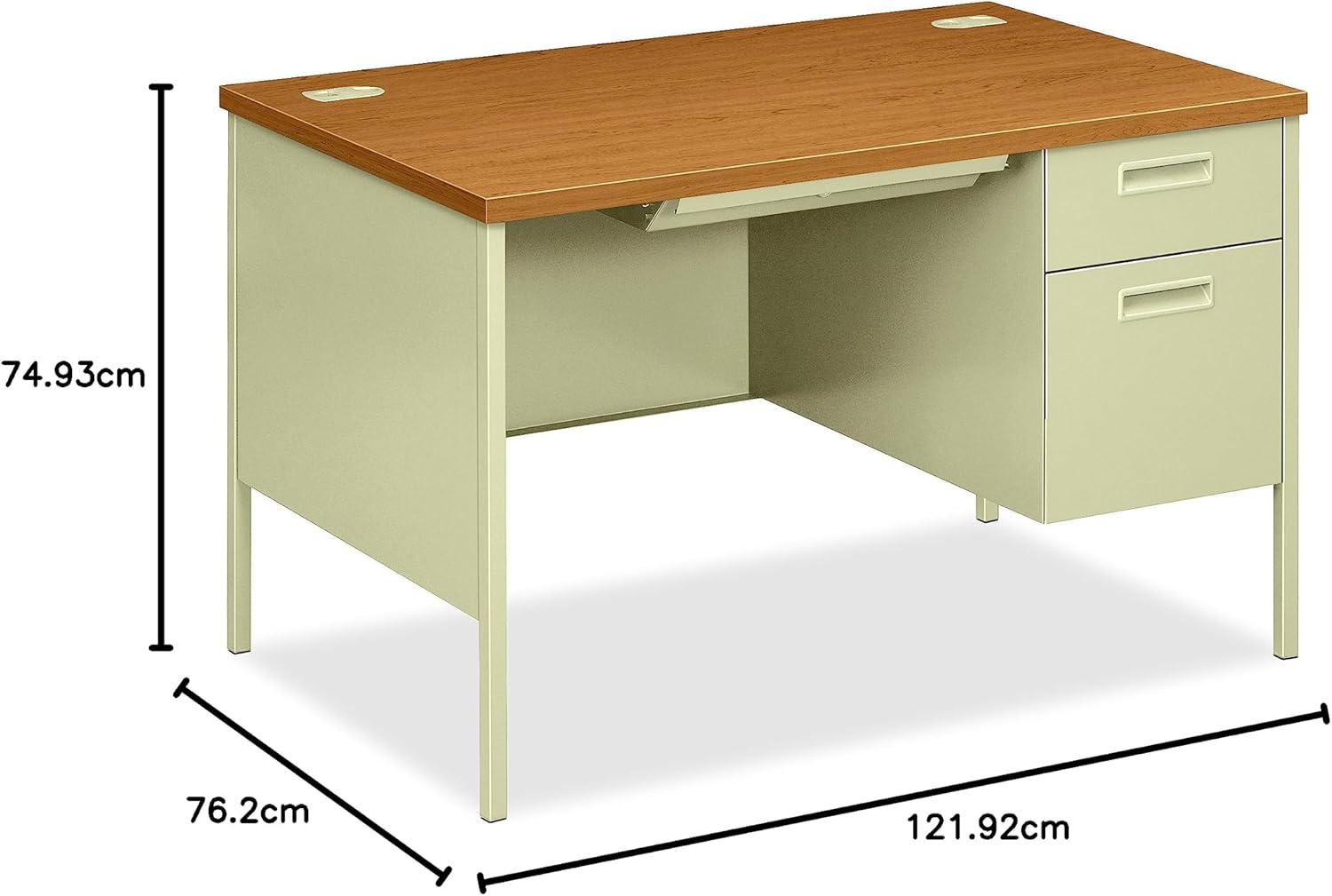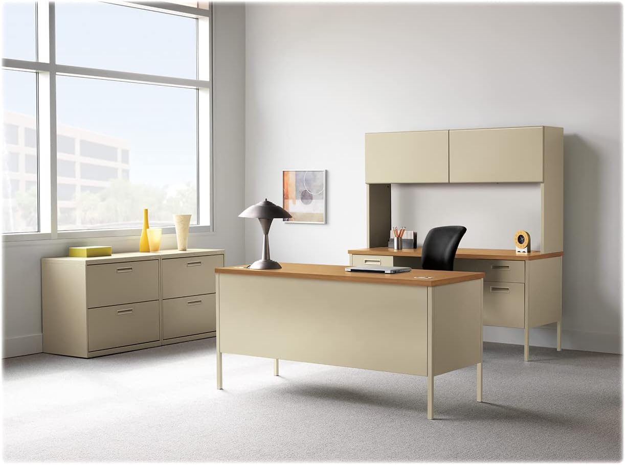 When people picture the definitive steel desk, what they see is Metro Classic from HON. This retro-styled collection features up-to-date amenities and best-in-class construction- the top surface is easy-care laminate that's scratch-, spill- and stain-resistant. The drawers feature Tru-Fit mitered fronts that align perfectly to the desk when closed. Central locking opens all drawers with the turn of a single key. This 48"W compact desk is specifically sized to fit into offices with limited floor space, to be used freestanding without other components. The laminate color is Harvest while the paint color is Putty. Metro Classic looks back on great style, and looks forward to great performance.