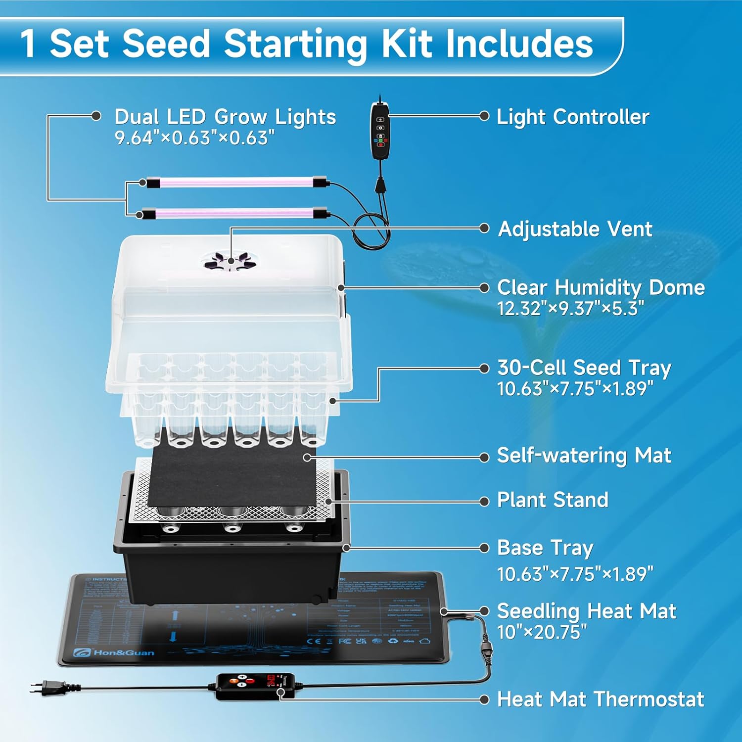 | Included Components | 1 x 30-Cell Seed Tray with Self-watering Mat and Plant Stand, 1 x Dual LED Grow Lights with Controller, 1 x Humidity Dome, 1 x Seedling Heat Mat with Thermostat, 2 x Manual |