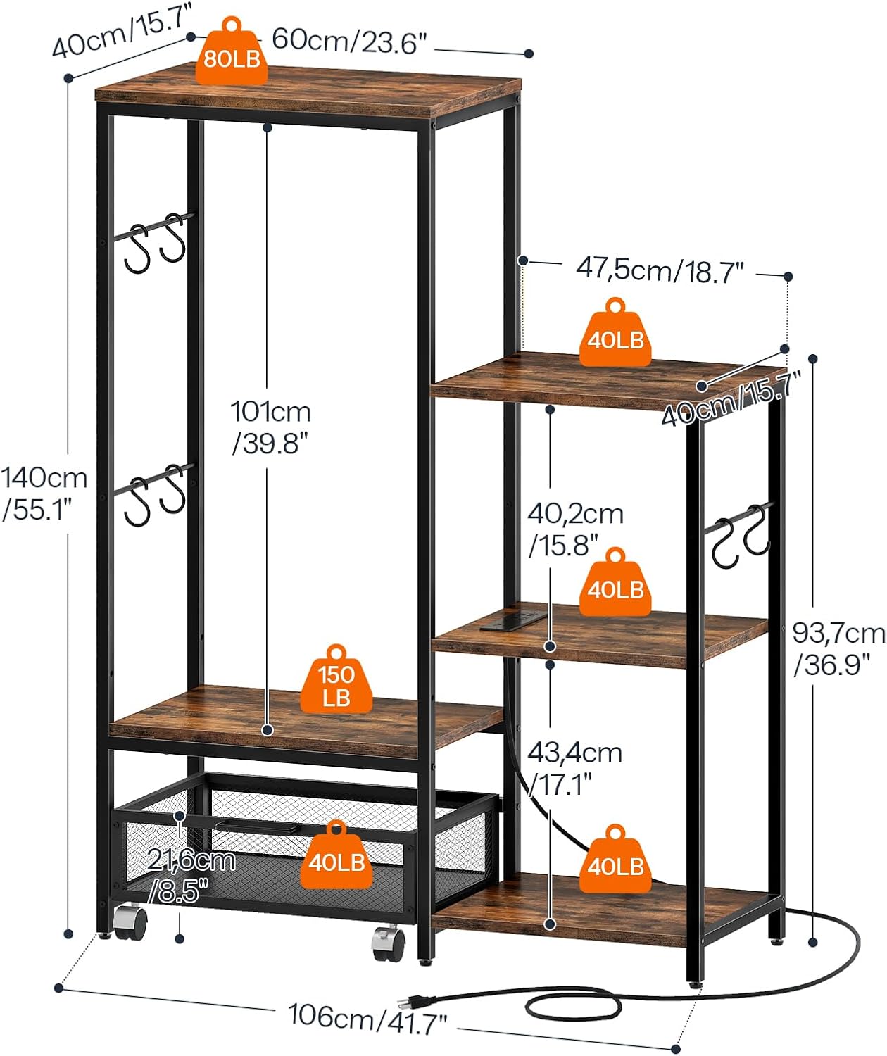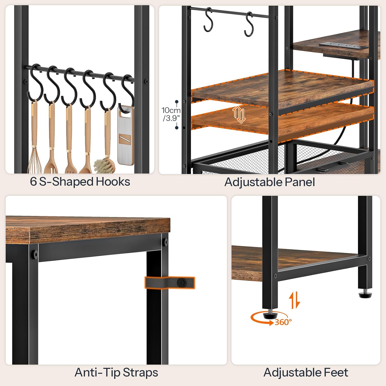 | Included Components | 1 x Accessory Kit, 1 x Anti-Tip Kit, 1 x Bakers Rack, 1 x Instructions, 6 x Movable Hook |