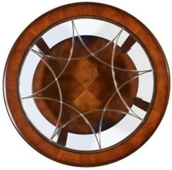 The warm casual cherry finish of the Brookhaven Round Cocktail Table is complemented by a stunning starburst-shaped brass inlay on the glass top. Timeless design details like fluted and softly-shaped legs complete the stylish flair. One lower shelf.Features:- Traditional style- Curved table legs- Wood base- Molded edges- 1 stationary shelf- Beveled glass insert- Top is constructed of cherry veneersSpecifications:- Product Dimensions: 19.75inH x 42.25inW x 42.25inD- Product Weight: 90lbs