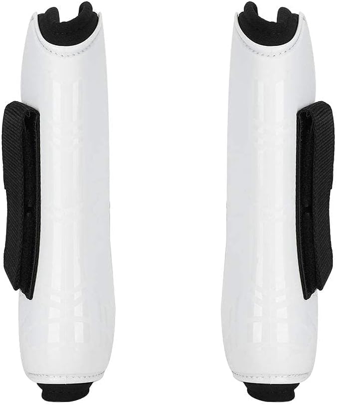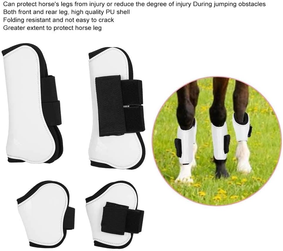 Horse Tendon Boots Can protecting horse's legs from injury or reduce the degree of injury during jumping obstacles. White tendon boots horse, Both front and rear leg, high quality PU shell, folding resistant and not easy to crack, greater extent protecting horse leg. Horse tendon support boots have fine workmanship, hook fasteners, strong viscous and no burr. Specification: Condition: 100% Brand New Item Type: Horse Leg Guard Material: PU + Neoprene Color: White Quantity: 4PCS Weight: Approx. 673g Front Leg Size: Approx. 11.8x25.6cm/4.65x 10.08inch Back Leg Size: Approx. 12.5x12.1cm/4.92x4.76inch Package List: 4 * Horse Leg Guard