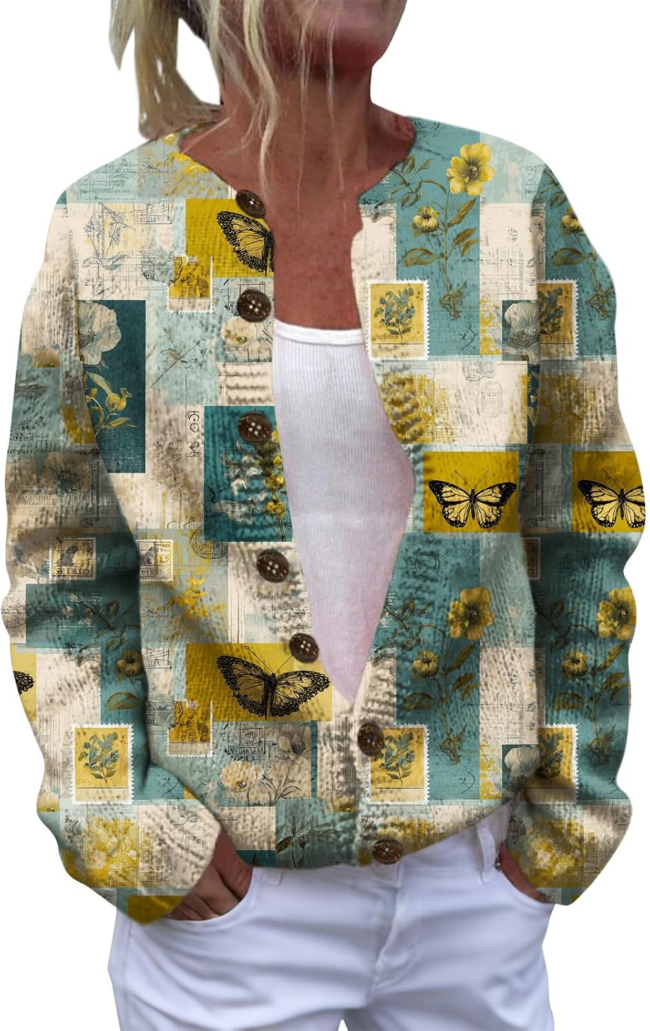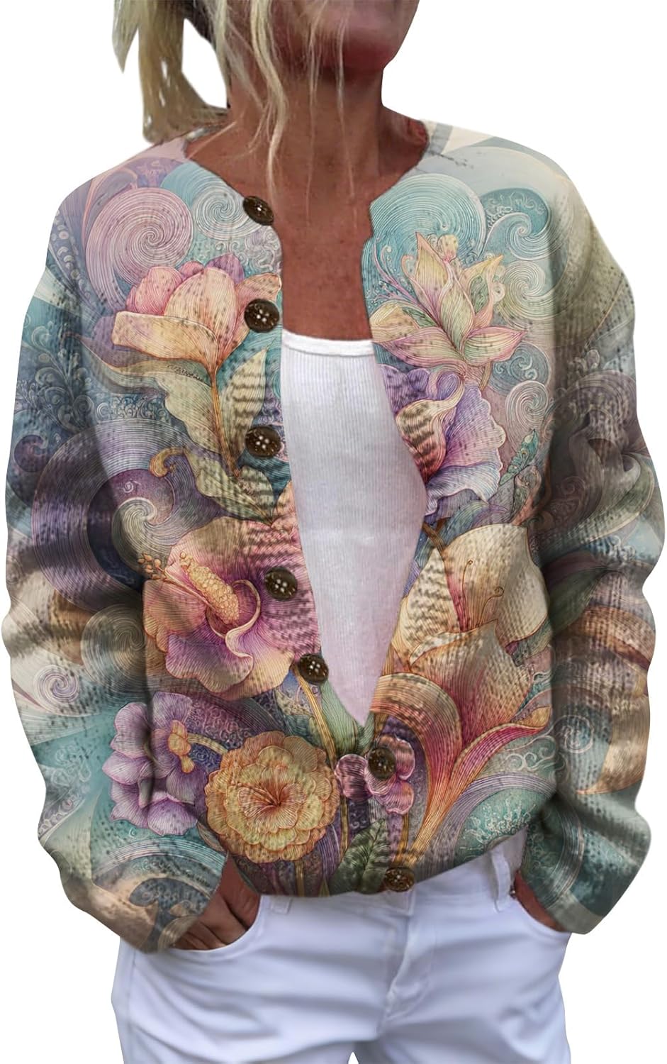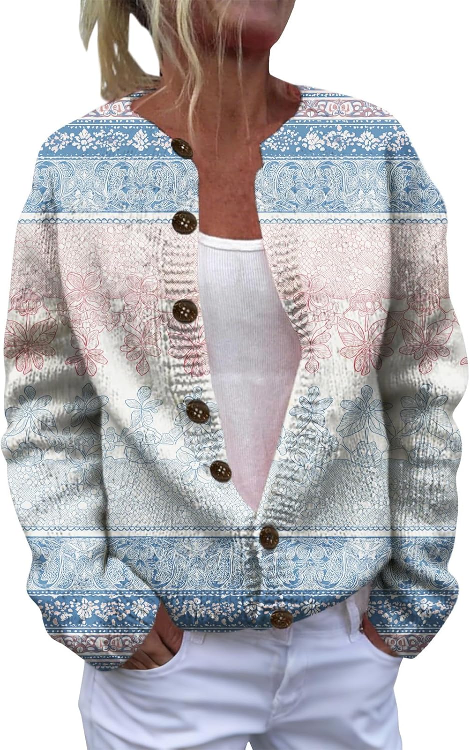 HOTYD Women's Boho Ethnic Floral Cardigans Sweaters Button Oversized Long Sleeve Open Front Sweater Plus Size Cozy Coats