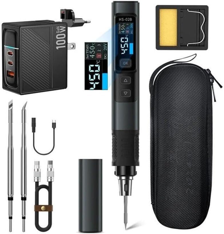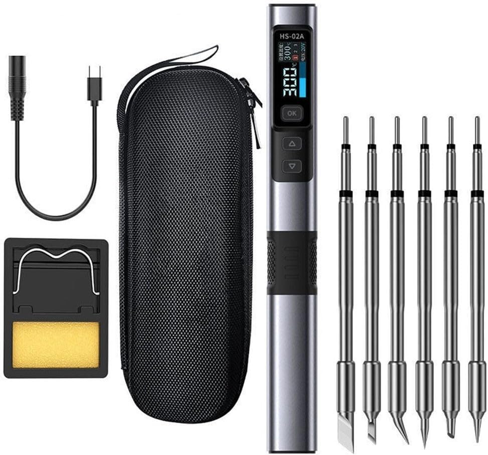 Features:* Innovative design, HS-02A internal heating for smart soldering iron, one-click technology makes your life better.* 9W-100W, high-power heating, heating and temperature recovery.* Electrostatic protection device, precise temperature regulation and control.* PD/QC/DC multi-protocol power supply.* CNC metal shell, 0.96-inch high-definition color screen.Specifications:Part name: HS-02A internal heating intelligent soldering ironPackage (optional): 90230-package 1, 90231-package 2, 90232-package 3, 90233-package 4, 90234-package 5, 90235-package 6, 90236-package 7, 90237-package 8Working voltage: DC9-24VTemperature: 100-450℃(180-842℉)Screen: 0.96 IPS high-definition color screenPower: 100WTinning time: 2SBody material: CNC aluminum alloy + siliconeOther features: adaptive power; ESD protection; preset temperature; sleep functionCharging interface: Type-CCharging protocol: PD/QC/DCSize: standardColor: as shown in the picturePackage details: (as follows)90230-package 1;- 1 x Soldering Iron- 1 x Adapter Cable- 1 x Soldering Iron Tip- 1 x Tool Bag- 1 x Mini Soldering Iron Stand- 1 x User Manual90231-package 2;- 1 x Soldering Iron- 1 x Adapter Cable- 6 x Soldering Iron Tip- 1 x Tool Bag- 1 x Mini Soldering Iron Stand- 1 x User Manual90232-package 3;- 1 x Soldering Iron- 1 x Adapter Cable- 1 x Soldering Iron Tip- 1 x Tool Bag- 1 x Mini Soldering Iron Stand- 1 x User Manual- 1 x Cable- 1 x 100W Power Adapter (US + EU)90233-package 4;- 1 x Soldering Iron- 1 x Adapter Cable- 6 x Soldering Iron Tip- 1 x Tool Bag- 1 x Mini Soldering Iron Stand- 1 x User Manual- 1 x Cable- 1 x 100W Power Adapter (US + EU)90234-package 5;- 1 x Soldering Iron- 1 x Adapter Cable- 1 x Soldering Iron Tip- 1 x Tool Bag- 1 x Mini Soldering Iron Stand- 1 x User Manual90235-package 6;- 1 x Soldering Iron- 1 x Adapter Cable- 3 x Soldering Iron Tip- 1 x Tool Bag- 1 x Mini Soldering Iron Stand- 1 x User Manual90236-package 7;- 1 x Soldering Iron- 1 x Adapter Cable- 1 x Soldering Iron Tip- 1 x Tool Bag- 1 x Mini Soldering Iron Stand- 1 x User Manual- 1 x Cable- 1 x 100W Power Adapter (US + EU)90237-package 8;- 1 x Soldering Iron- 1 x Adapter Cable- 3 x Soldering Iron Tip- 1 x Tool Bag- 1 x Mini Soldering Iron Stand- 1 x User Manual- 1 x Cable- 1 x 100W Power Adapter (US + EU)Package Contents:1 x HS-02A Internal Heating Smart Soldering Iron Kit