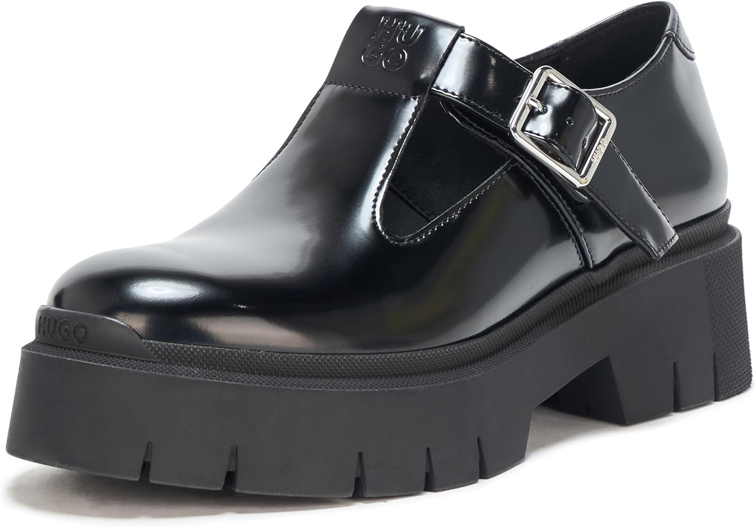 Chunky platform Mary Jane shoes crafted in a shiny brush leather. These shoes have a buckle closure and detailed with a stacked logo on the front.
