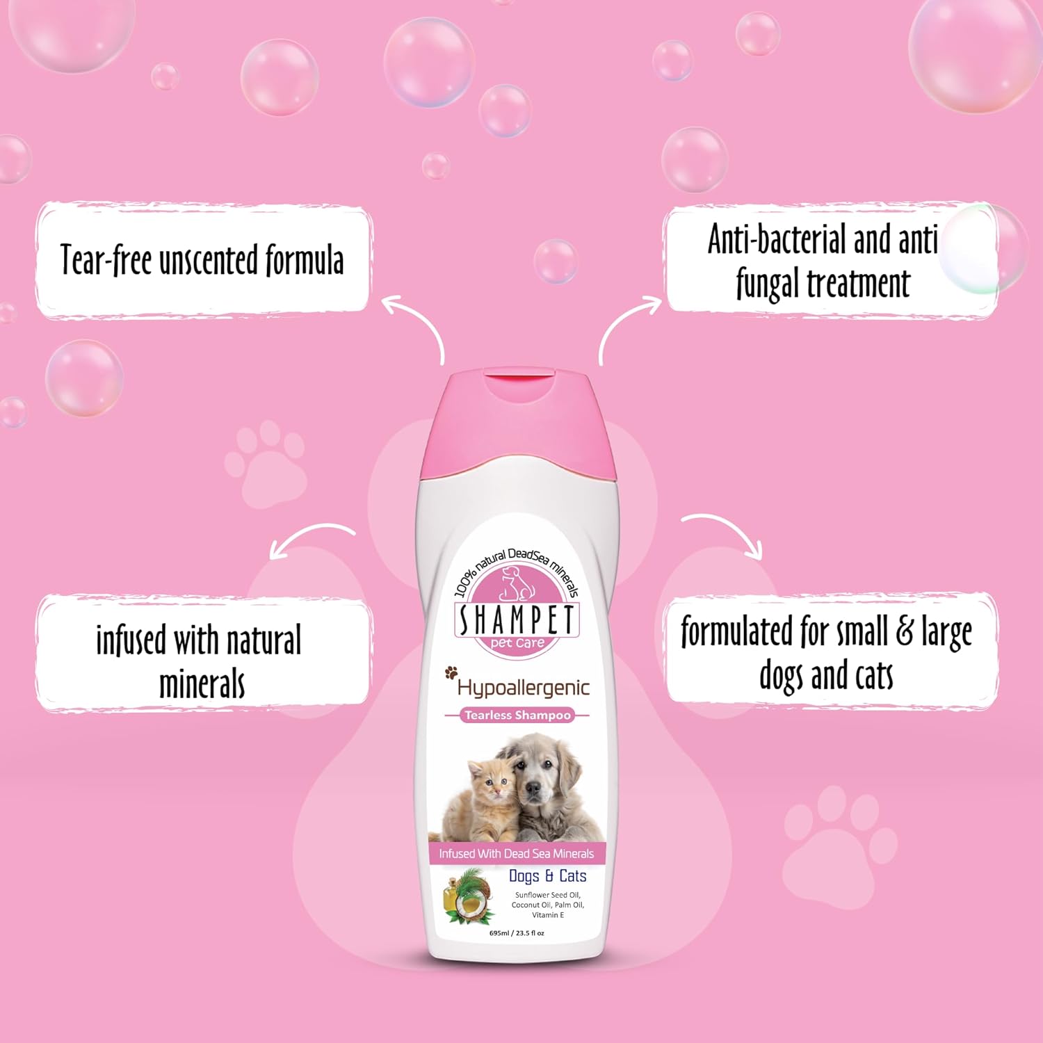 Shampet Unscented Mineral Shampoo (695 ml) A gentle, fragrance-free grooming shampoo designed for dogs and cats with sensitive skin or owners who prefer no added scent. Mineral-infused with Dead Sea minerals and formulated with skin-friendly oils, it cleans without a heavy residue and leaves the coat soft, clean, and easy to manage. Ideal for regular baths across all coat types and life stages.