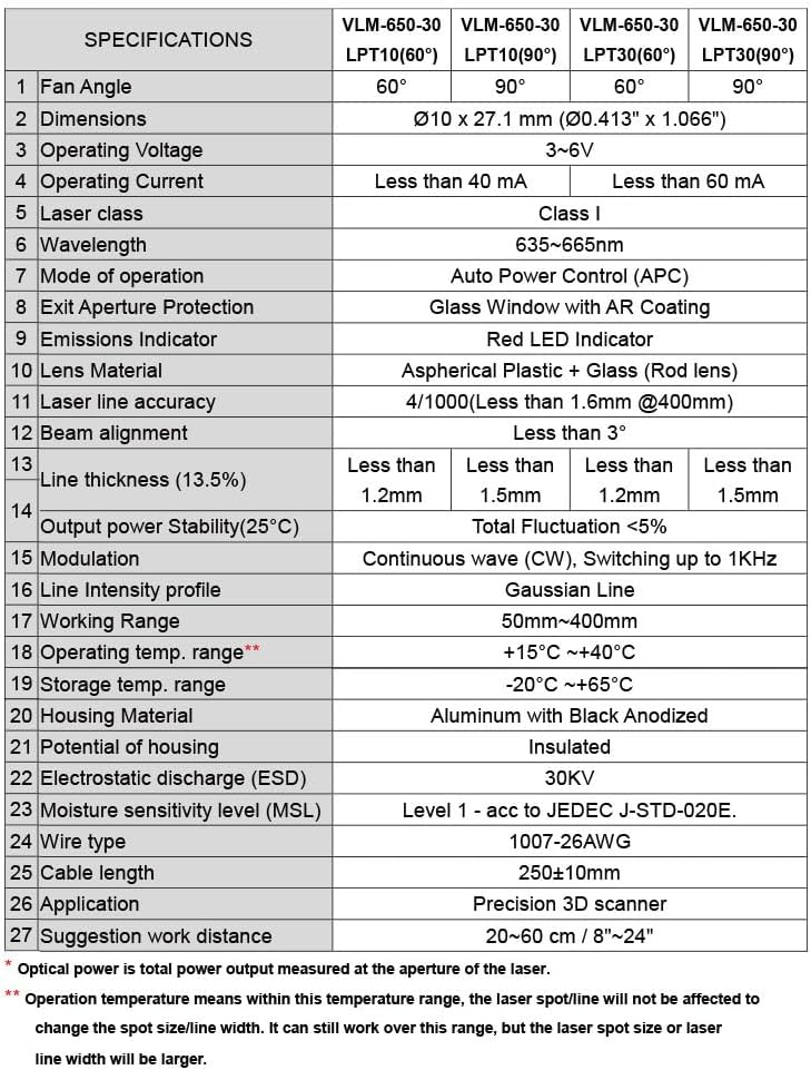 Specifically optimized for Industrial 3D scanner. High accuracy Red Straight Line Laser, Line-width optimize at short distance (50~400mm), for Industrial high-precision barcode reader, leveling, alignment, adjusting, measuring and targeting device. Product details: Dimensions: Ф10 x 27.1 mm (Ф0.394" x 1.067") Wavelength : 650 nm Fan Angle : 90° 5 V operation voltage. Connection type: Lead wire Built-in Laser Emissions indicator (LED)Operating Temperature: +15°C ~ +30°C Storage Temperature: -20°C ~ +65°C