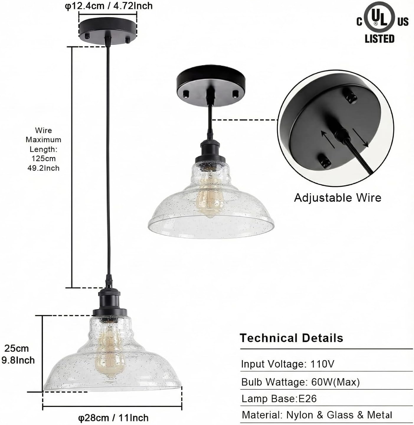 Industrial Pendant Lights, Vintage Hanging Light Over Table, Black Bubble Dome Glass Lampshade, Black Lamp Head and Base, Adjustable Hanging Height Lighting Fixtures.