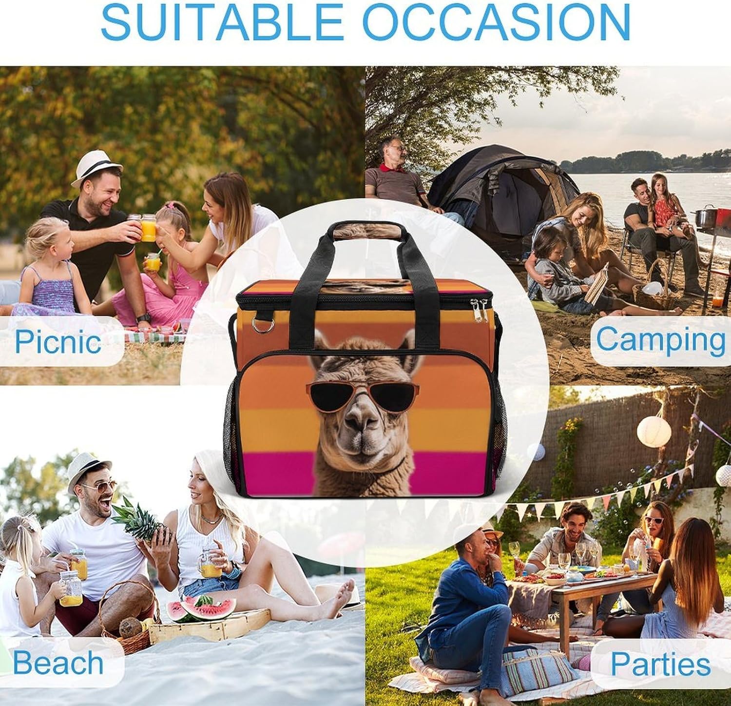 Take Your Meals Anywhere with Camel Wearing Sunglasses Grocery BagsFood Container Carrier Oxford Fabric Picnic Bag Heat Retaining Food Bag Camping Cooler BBQ Accessories Cute Picnic Bag with Pockets Insulated Food Bag for Work Insulated Lunch Tote Bag Camping BagTemperature Control That WorksThe upgraded aluminum foil lining creates an effective thermal barrier. Your drinks stay refreshingly cold, and your hot dishes maintain their warmth for hours. No more lukewarm meals during outdoor outings.Thoughtful Storage DesignTwo side mesh pockets - Perfect for water bottles or umbrellasFront zippered pocket - Keeps keys, phone, or condiments organizedInternal mesh pocket - Stores utensils, napkins, and small essentialsMain compartment - Spacious enough for food containers and snacksBuilt for Daily AdventuresConstructed from high-density oxford fabric with reinforced stitching at stress points. The double zippers are sturdy and smooth-operating. Reinforced handles let you carry heavy loads with confidence.Carry Your WayHandles for quick grabbingStands upright for easy packing and accessPerfect For:Picnics in the parkBeach days and pool partiesCamping and hiking tripsOutdoor concerts and festivalsDaily work lunchesGym and fitness classesRoad trips and travelGrocery shoppingSpecifications:Dimensions: 15.4 x 11.8 x 11.8 inchesMaterial: High-density Oxford fabricLining: Aluminum foil (insulated)Closure: Sturdy double zippersPockets: 2 side mesh, 1 front zipper, 1 internal meshCare: Hand wash or machine wash, do not bleachNote: Food containers and utensils shown in images are not included.
