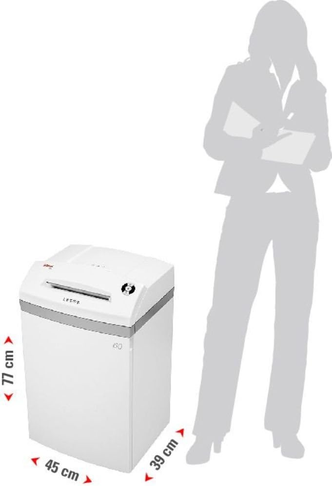 Intimus 279294S1 Model 60CC6 High Security Paper Shredder, Low Noise Level, Illuminated Indicators, Auto Reverse Function for Paper Jams, Mounted On RollersThe Intimus 60 CC6 unit is highly efficient and effective document shredder. The 60 CC6 is designed to be robust and reliable, with a durable drive system with gears custom designed for the demands of the job, a microprocessor-controlled auto-reverse and anti-jam system, and integrated automatic oiler. For convenience of use, the 60 CC6 Security Shredder features 16 gallon (60 liter) waste bin. It includes illuminated alerts for stand-by, door open, paper jam, and basket full. Its compact size, reliability, and vast shredding capacity has made these Security Shredders the favored solution of American and global government security agencies around the globe. Dimensions: 30.5" H x 17.75" W x 15.5" D. Weight gross: 79 lbsKey FeaturesFastest, highest volume small NSA Level 6/P-7 on the marketShreds 9 reams per hour--500 more sheets per hour than nearly all similarly sized Level 6/P-7 shreddersShredder of choice for the DOD and DOS for many years, with thousands deployed in government offices throughout the worldRobust, chain-driven system with integrated automatic oilerWaste bin capacity: 16 gallon/60 literSpecificationsThroat Size (mm): 405Shred Speed (cm/min): 457Shred Size (mm): 0.8 x 4.5Sheet Capacity (sheets): 4 - 8 NSA EPL Test: 4 sheets at a time, 9 reams per hourHorsepower (HP): 3/4Continuous Motor: YesBin Capacity (litres): 60Voltage / Frecuency (volts / hz): 120 240 / 50 - 70Weight (pounds): 79Dimensions: 30.5" H x 17.75" W x 15.5" D
