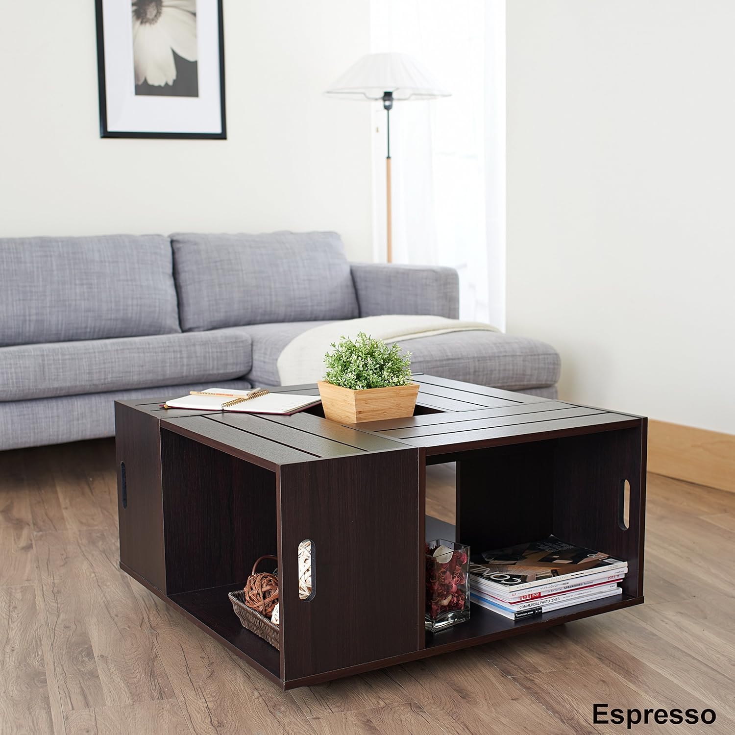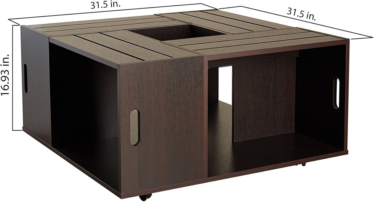 Add a conversation starter to your living space. The Trenton Crate Coffee Table features a unique design that only gets better. The center of the table features an unusual insert that can be closed for a smoother table top appearance or flipped over to reveal a handy tray. With the included tray, drinks are less likely to fall and items are never going to roll off the center. The detailed lines and slats ensure this beauty becomes a highlight in your living space while the geometric design creates four spacious open storage places. You'll easily keep your area neat and tidy when you stow magazines and accessories underneath the tabletop. Additional casters are included to move this durable piece around the house! Product made of medium fiber board and finished in espresso. To clean, use damp cotton cloth to wipe clean. Made in Taiwan, assembly required. Overall dimensions: 31.5"L x 31.5"W x 16.93"H. All décor and items are not included in this offer unless specified.
