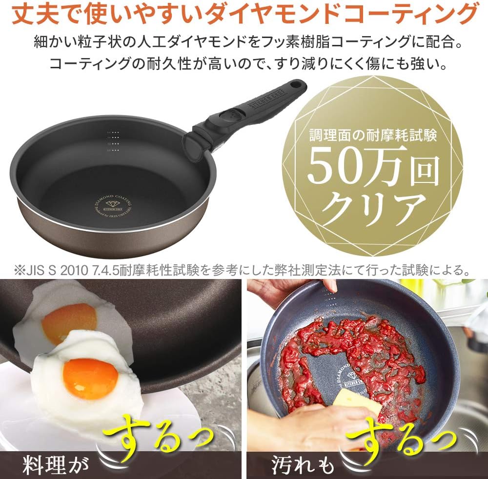 The popular diamond coat pan introduces a deep series that matches Japanese food culture. The frying pan is easy to make not only fried foods, but also soup or boiled food. There are markings on the inside of the pan and pan, so it is convenient to measure water like a measuring cup. You can even use the handle to cook in the oven. Compatible with gas fires. Not for induction use. Cannot be used in microwaves. Simply squeeze to attach the handle. Easy to set up. The handle of the glass lid is foldable for compact storage. The seal lid is convenient for storing your pot in the fridge. Can be stacked for storage. What is diamond coating? Created diamond is a fine grain formula with a fluorine resin coating. Tested for abrasion resistance on cooking surfaces 500,000 times. According to the Iris Ohyama measurement method, based on JIS S 2010 7.4.5 abrasion resistance test.