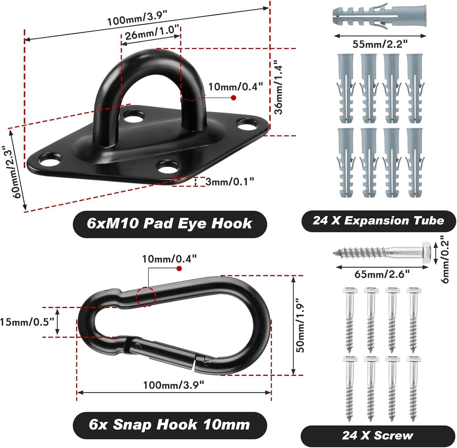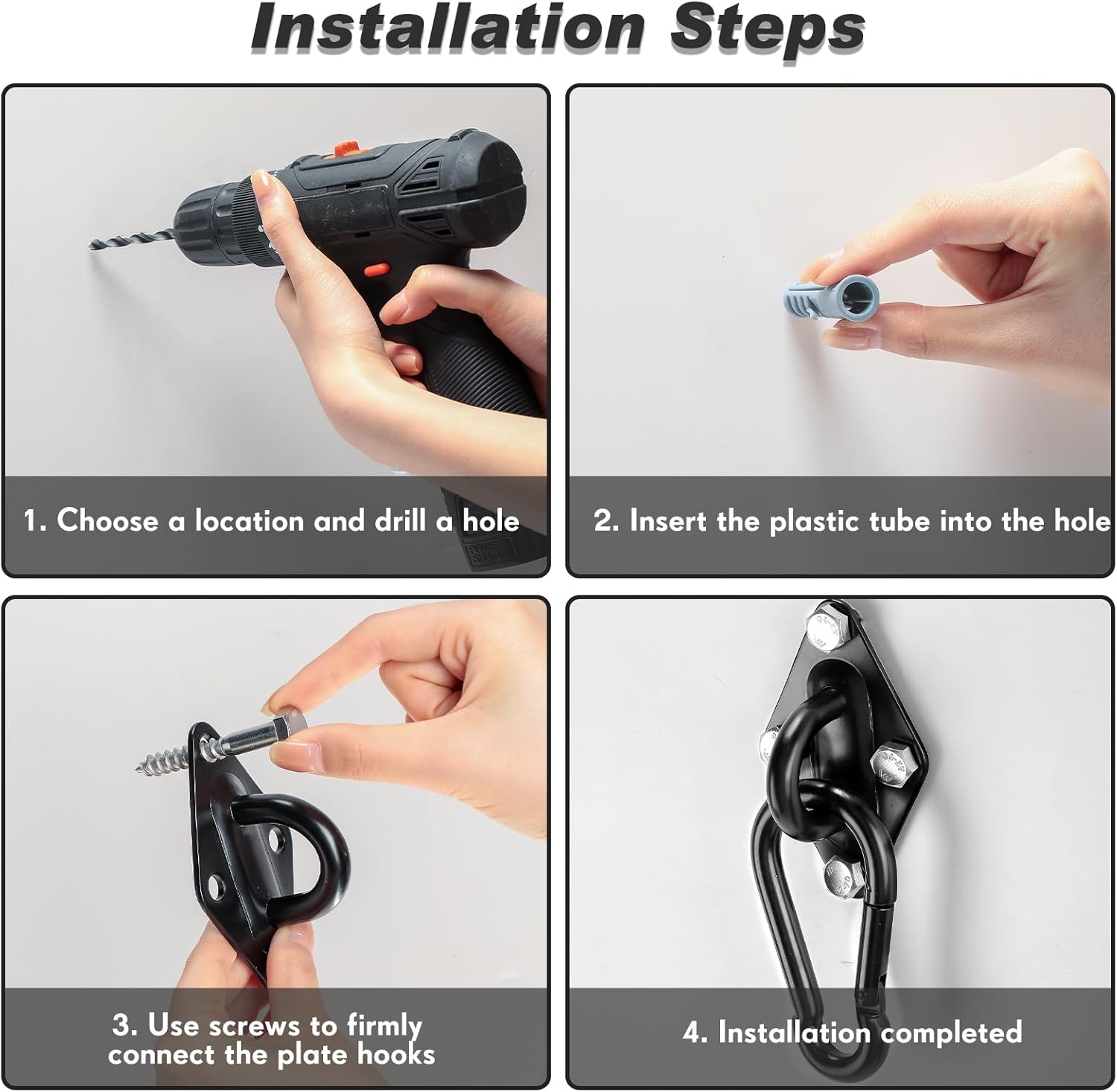 Features: These swing hooks can be routinely applied indoors or outdoors. Their versatile usage extends to connecting hammock chairs, porch swings, small yachts, roof beams, and ceilings. The basic process involves drilling holes, inserting plastic plugs, and securely connecting the pad hooks using the supplied screws. The spring hooks ensure easy clipping and removal for prompt installation. Specifications: Material: main stainless steelColor: main black Size: as pictures shownPackage includes: 6 x Plate hooks6 x Spring hooks24 x Screws24 x Plastic plugsNotes: Manual measurement, please allow slight errors on size. The color may exist a slight difference due to different screen displays. Small parts included, please keep them away from little kids to avoid swallowing risk.