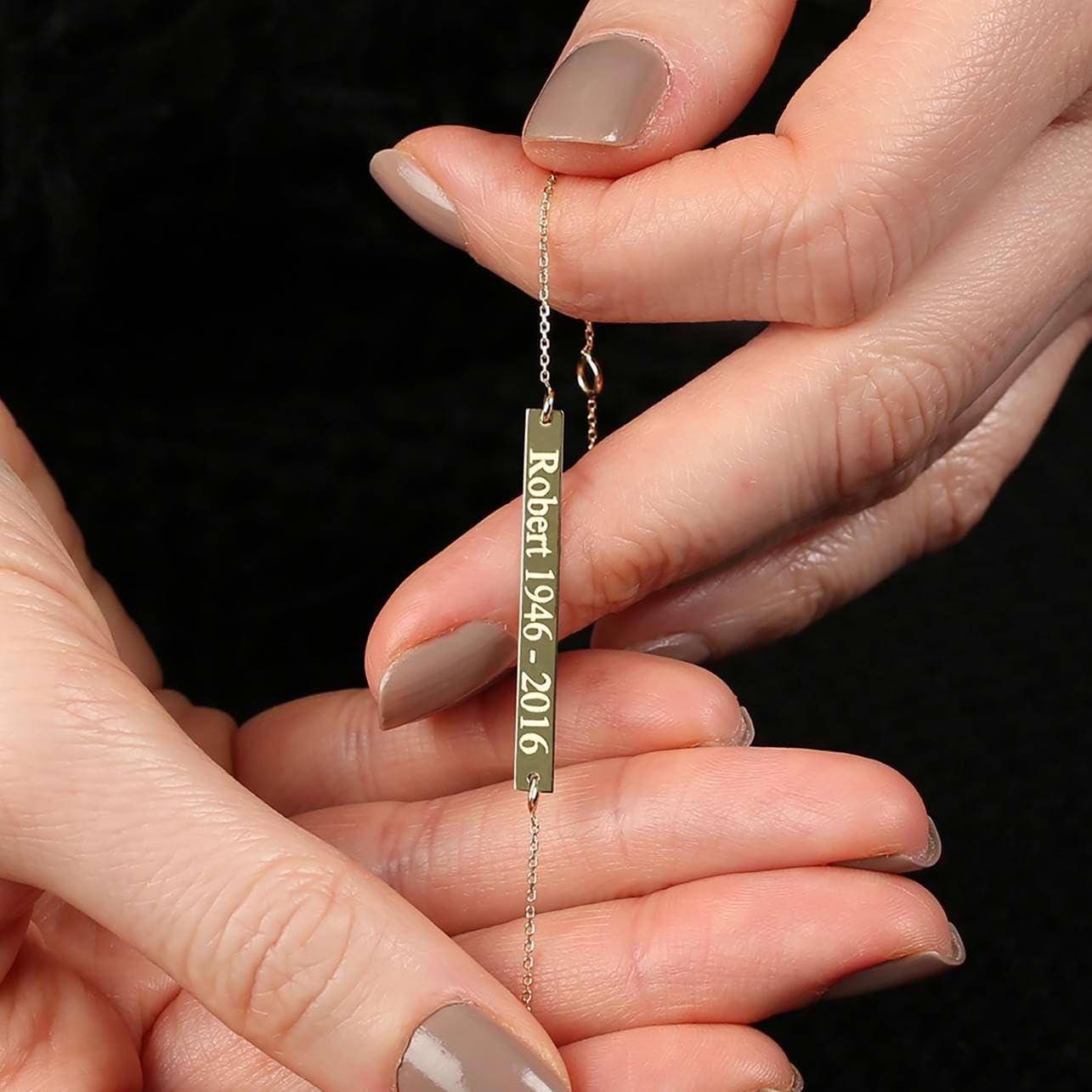 Enhance your jewelry collection with our personalized engraved bar bracelet in 14k gold. Personalize it with a name, date or message, making it an ideal gift for memorial occasions, friendships, medical ID cards, birthdays, Christmas and Mother's Day.
