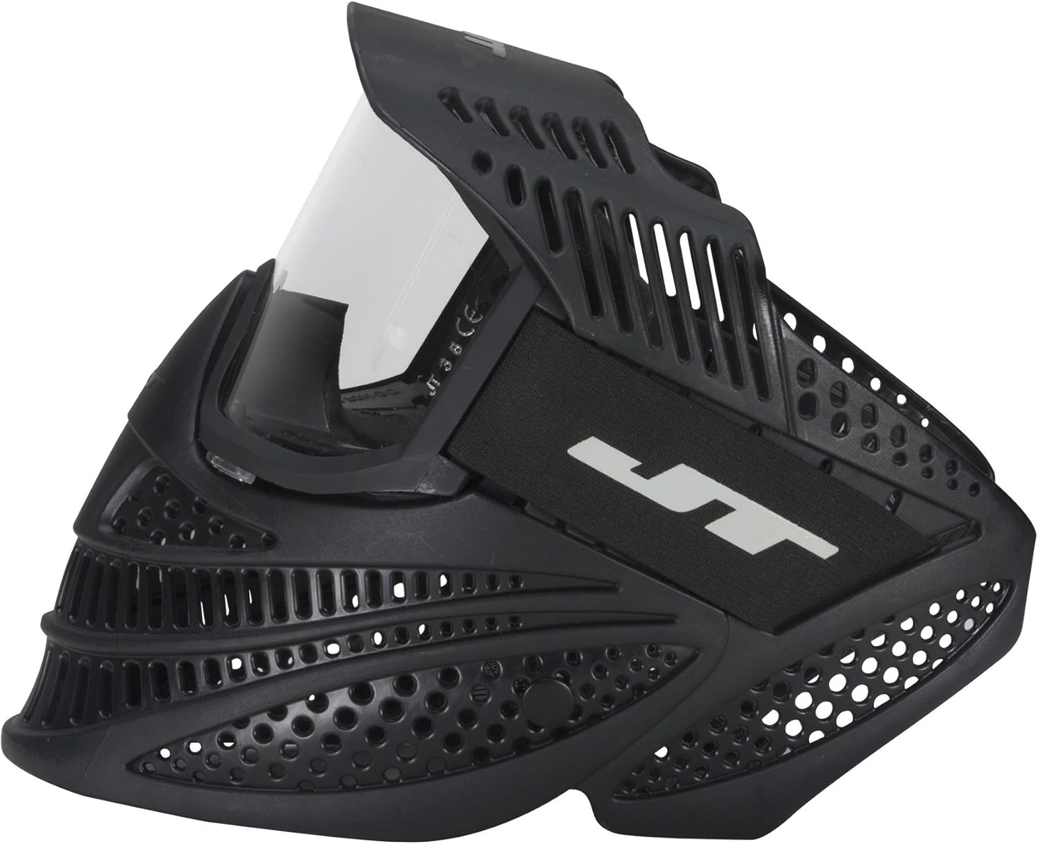 JT decided that the players on a budget deserve some style, too. The JT Elite Prime Single Paintball Goggle blazes a new trail with both aggressive looks and smart features in an entry level priced paintball goggle. The JT Prime Single Paintball Goggle utilizes the popular JT Elite lens design. The Elite features 190 degrees of clear vision and a slimmer goggle frame. This smaller frame makes it ideal for those with narrow facial features and youth players. The one piece mask is molded from flexible material to conform comfortably to anyone's head. Rather than the same old boring holes, the Prime is ventilated from mouth to ears in an aggressive looking criss cross pattern to make breathing easy and increase airflow. A short visor is integrally molded over the goggle frame to keep the sun out of your eyes and the rain off your lens, yet is short enough to be clear of your hopper.