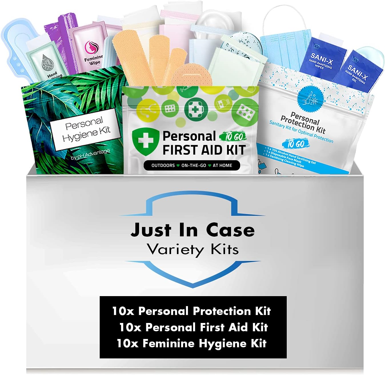 This comprehensive care package caters to a wide range of personal needs, making it an essential item for outreach, donations, and emergency preparedness. Our all-in-one box contains 30 individually wrapped kits, neatly organized into three distinct categories: 10 Personal Protection Kits: Each kit includes a disposable cloth ear loop face covering, a disposable hand sanitizing wipe, and a sachet of alcohol hand sanitizing gel, ensuring you stay safe and sanitized in any situation. 10 Personal First Aid Kits: Be prepared for minor injuries with this well-stocked kit containing four assorted sized bandages, two 12-ply 2x2 gauze pads, an antiseptic wipe, burn gel, triple antibiotic ointment, and a disposable alcohol hand sanitizing wipe. 10 Personal Feminine Hygiene Kits: Tailored for women’s needs, each kit contains a tampon, a maxi-pad, two feminine wipes, and a disposable hand sanitizing wipe, providing comfort and hygiene when it’s most needed. Each kit is compact, lightweight, and hermetically sealed in a resealable and reusable zip-top bag for easy transport and use. The Just in Case Variety Pack is perfect for assisting those in less fortunate circumstances, delivering all the essentials in pocket-sized packages. Show love and care effortlessly with this variety pack, designed to meet the essential needs of any individual.
