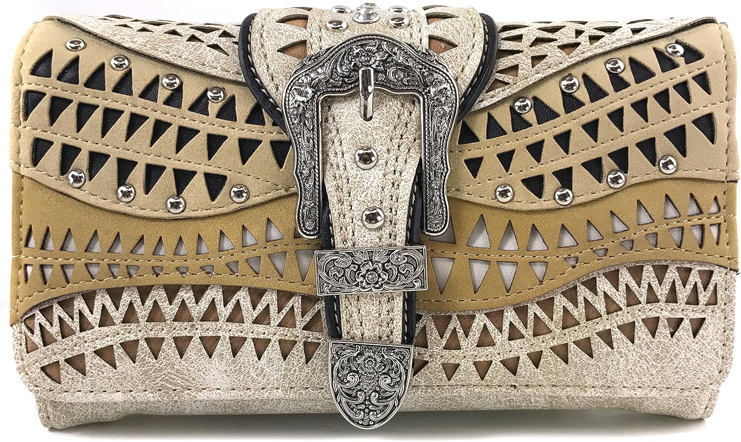 Cute and fashionable western purse with buckle and rhinestones. Available in many beautiful and vibrant colors! Justin West Studs Laser Cut Triangle Western Rhinestone Buckle Handbag Purse Conceal Carry Features Top Zipper Closure, Interior Middle Zipper Divider Pocket with Multiple Interior Size Pockets, Back Phone Slot and Zipper Concealed Carry Pocket.