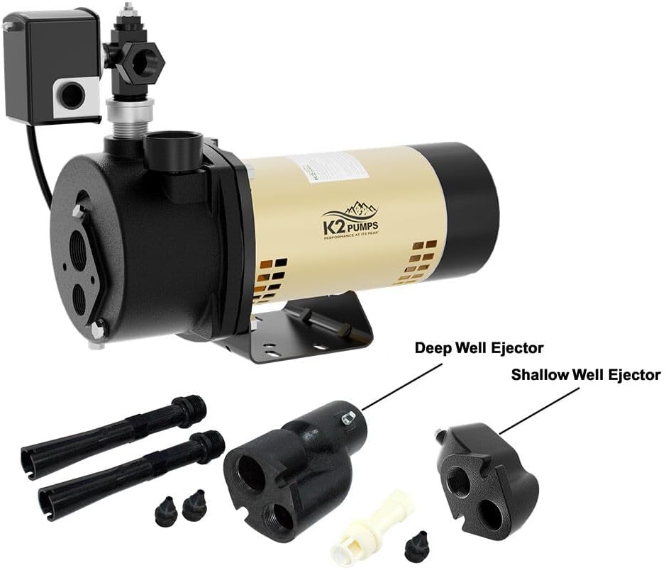 The K2 Pumps 3/4 HP Convertible Jet Pump is constructed of heavy-duty cast iron. Convertible jet pumps can be used in both shallow well or deep well applications. Certified lead-free to NSF/ANSI/CAN 61 and NSF/ANSI 372. The pump is installed above ground for shallow wells with depth to water from 0' to 25', or deep wells up to 90'. The pump delivers up to 20 GPM at 0' of lift, with a maximum pressure shut off at 70 PSI. It comes with a 115/230-Volt dual-voltage motor which is preset at 230-Volt. Includes the ejector kit and pressure regulator.