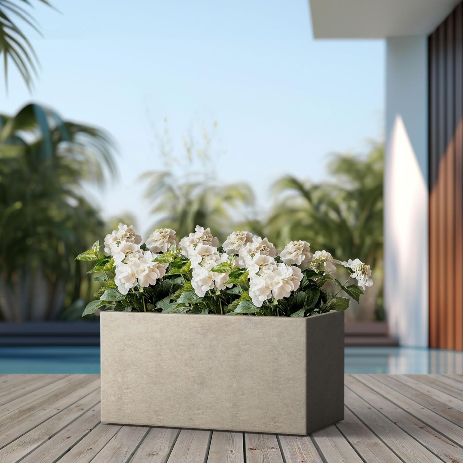 Kante 23.2"L Rectangular Concrete Planter, Large Outdoor Indoor Garden Pots with Drainage Hole and Rubber Plug, Modern Decor for Home, Patio, Backyard, Weathered Concretel Elegant Concrete Planter – Discover a modern design with smooth, flowing curves and a naturally weathered finish that exudes timeless appeal. Crafted with care, this statement piece seamlessly blends contemporary style with organic texture, featuring subtle pores that enhance its authenticity. It adds a refined touch of character to different surroundings.Handmade Plant Pot – Made from a premium concrete mixture, this pot maximizes durability, strength, and resistance to weather and damage. Its enduring color, combined with UV resistance, ensures that it maintains its vibrant appearance under the outdoor conditions.Large & Versatile – Whether showcasing a plant indoors or positioned on the front steps, porch, or patio, this generously sized planter enhances modern, minimalist, and traditional styles with its unique design. Its versatility makes it well-suited for a variety of settings.Drainage System – Our planter pot features drainage holes for efficient water management, each equipped with a rubber plug for both indoor and outdoor use. Enjoy effortless gardening with minimal upkeep, promoting a healthy environment for your plants.