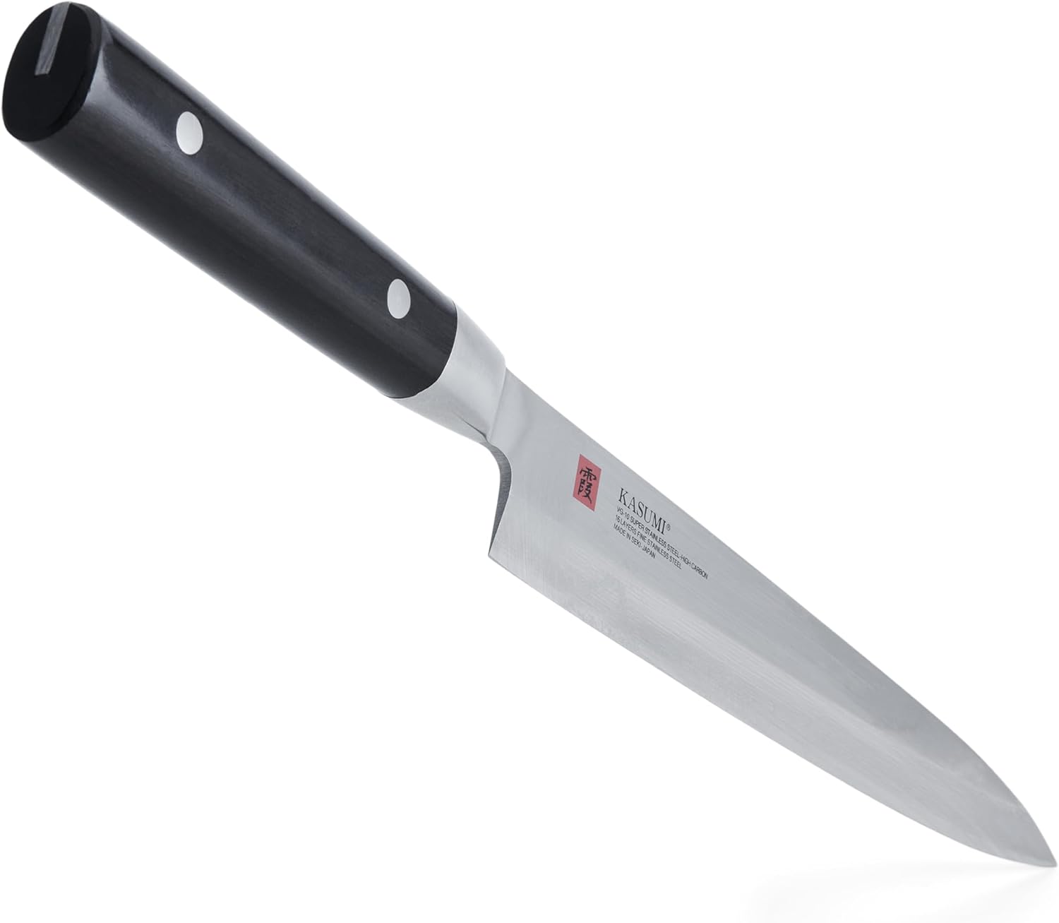 Kasumi knives are produced by Sumikama Cutlery in Seki, Japan. Sumikama Cutlery specializes in producing knives from the most advanced materials with the most advanced manufacturing techniques. Kasumi V-Gold No. 10 Damascus Pattern knives are made from 33 layers of stainless steel. Only the middle layer acts as the cutting edge, and it is made using V-Gold No. 10 stainless steel. V-Gold No. 10 is a high carbon stainless steel with cobalt, manganese, molybdenum and vanadium for added durability and ease of sharpening. The addition of cobalt to this steel requires special tempering in order to maximize the full benefit of this steel. Sumikama's technique for this special tempering is a closely guarded secret.