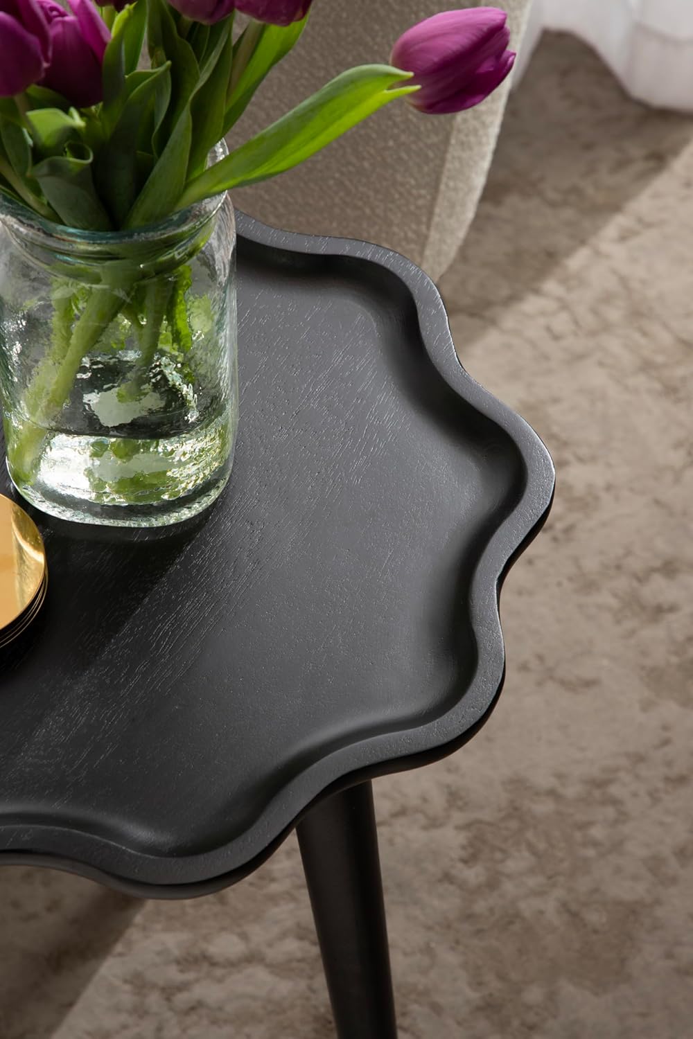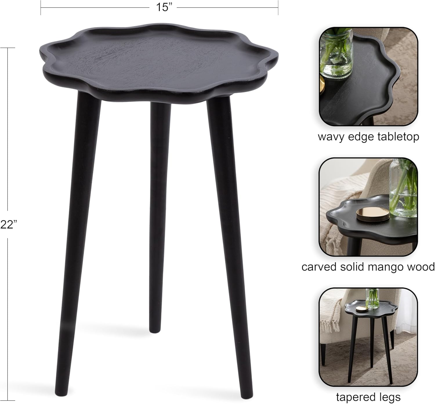 Our delightful, eye-catching Alezar collection features a bold assortment of side tables! The Alezar living room table was made in India from solid mango wood with a gorgeous wavy edge. Due to the unique design of the Alezar collection, each piece is distinct and one-of-a-kind, with visual variations in woodgrain that make the table uniquely yours. This particular Alezar table features a black finish that radiates optimal sophistication, creating a piece that feels storied and visually captivating. The overall dimensions of this side table are 15 inches wide by 15 inches deep by 22 inches tall, making it the perfect size to flank your couch, vanity, bed, or entryway. This 15-inch diameter is fantastic for showcasing decorative accents like photos or a small lamp, serving cocktails on coasters, or acting as your nightly catch-all as a bedroom nightstand. Your new side table is ready in a matter of seconds thanks to the no-tools assembly process; screw the individual wooden legs into the tabletop to begin enjoying your new statement piece.