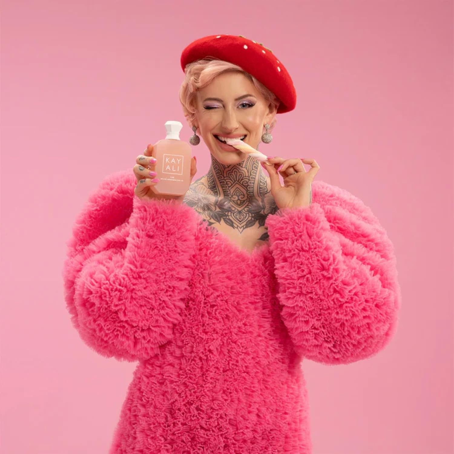 This fragrance features a delightful menu of mouthwatering notes, including fluffy pink marshmallow, succulent strawberry, flaky coconut, delicate freesia, whipped vanilla, and pink musk. Boujee, fluffy, and delicious, this luxurious scent will linger with sweet temptation with every spritz.