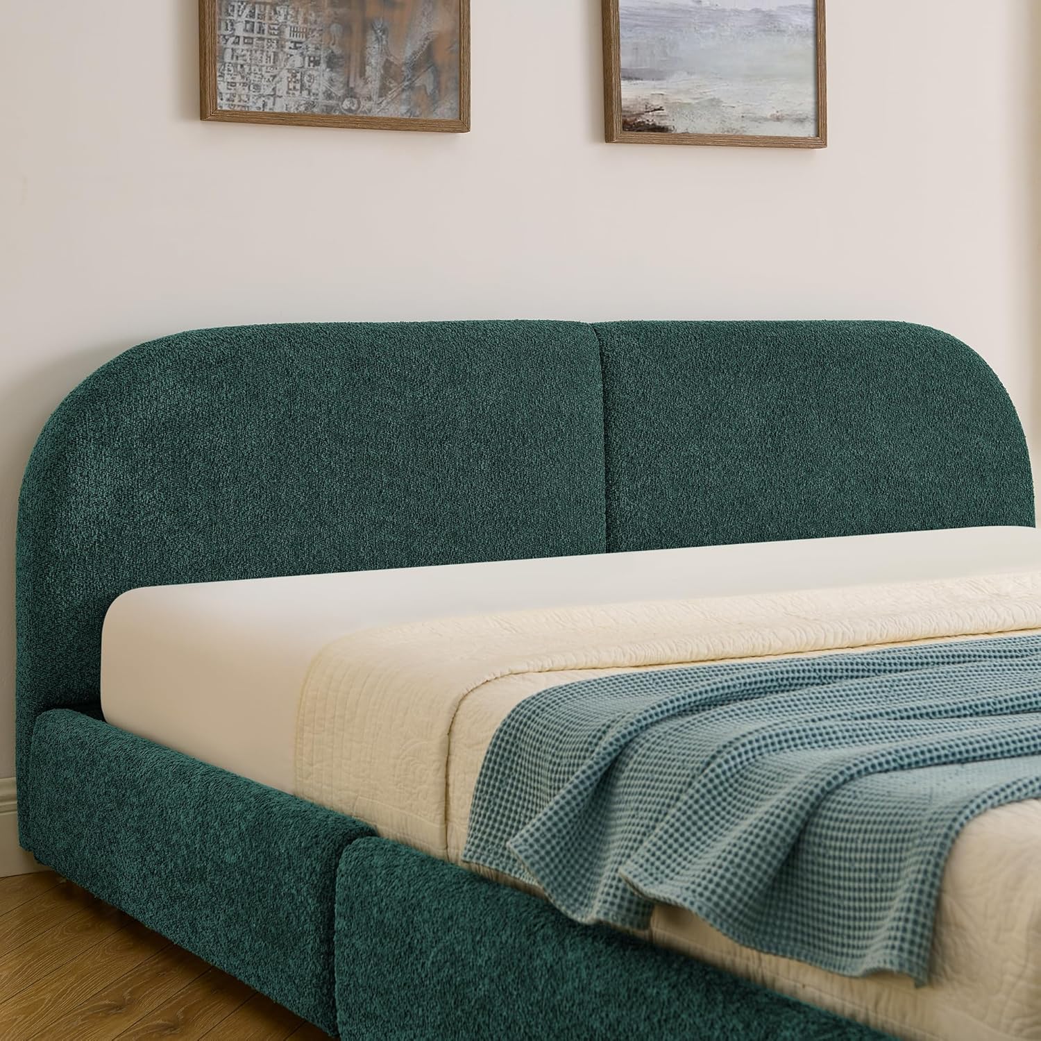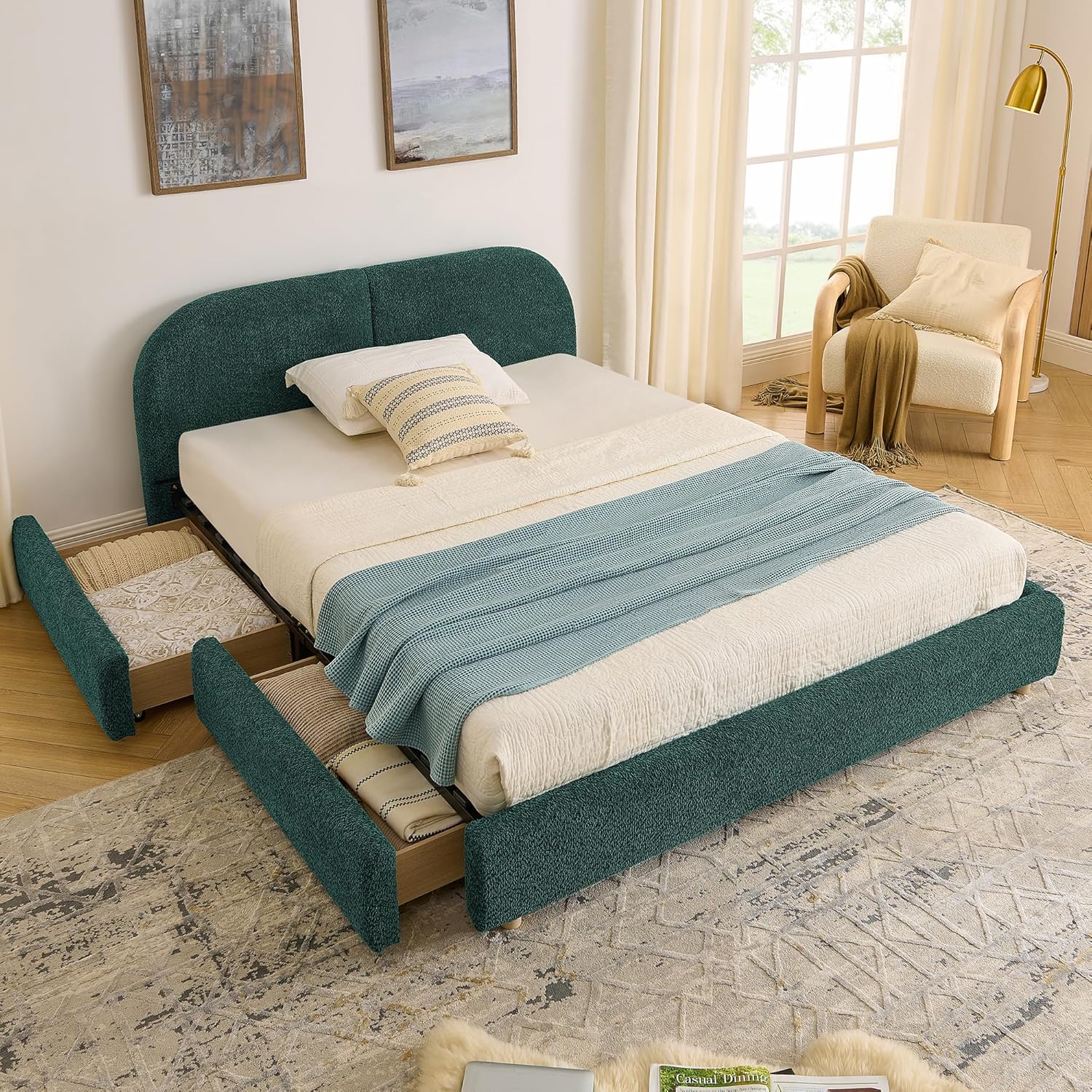 Upgrade your bedroom with this modern minimalist upholstered bed frame, designed to combine comfort, style, and practical storage. The spacious platform bed layout provides a comfortable sleeping area while enhancing the overall appearance of your bedroom.The bed features a tall curved upholstered headboard covered in circle yarn fabric, creating a soft and elegant look while offering comfortable back support for reading, watching TV, or relaxing in bed. The sturdy MDF structure with reinforced leg support ensures reliable mattress support and stable everyday use.For added functionality, the bed frame includes four wheeled storage drawers, providing convenient under-bed storage for bedding, clothing, or daily essentials. With its modern design, durable construction, and practical storage solution, this upholstered platform bed frame is a stylish and functional addition to any bedroom.