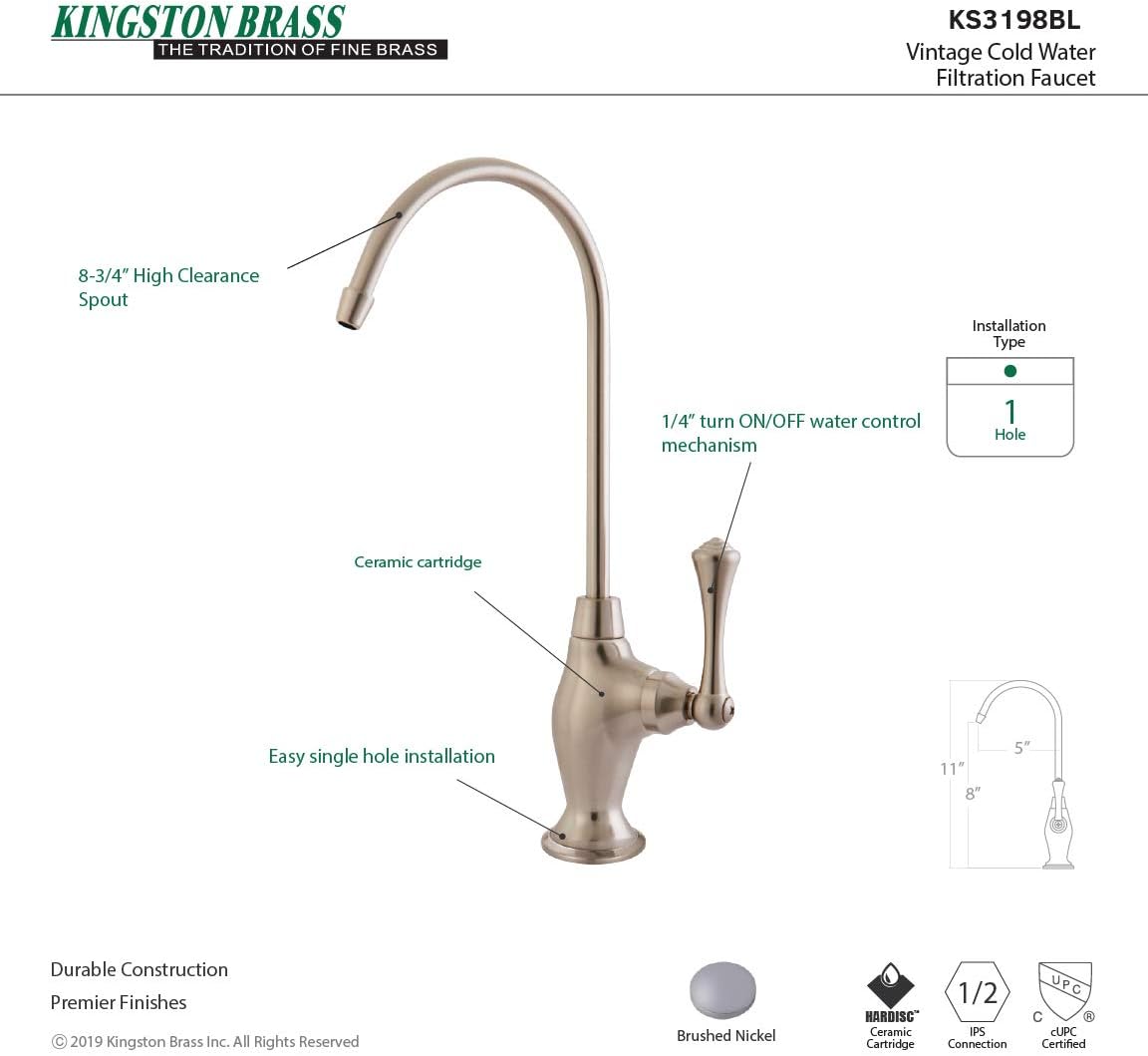 Product Description Allow this faucet to provide you with instant, crystal clear drinking water while reducing plastic waste. Ergonomically designed, it will enhance your kitchen's traditional theme while adding functionality. Use with an under the counter water filtration system. From the Manufacturer The subtle, glamorous design of this Vintage water filtration faucet from Kingston Brass offers all that you need for drinking water in the kitchen. The faucet is sturdy, sleek and made from solid brass to allow you years of good use. Offered in a number of finishes (polished chrome, polished brass, oil rubbed bronze, satin nickel), the design enables you to fill small and large containers for drinking or holding water.