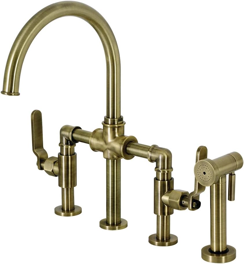 This faucet's modern features create a bold and edgy design in your kitchen. While bridge faucets typically have a traditional appeal, this particular industrial design is a more modern interpretation. Allow the brushed brass finish to pop against your surrounding kitchen decor due to the added architectural elements. The brass construction and swivel abilities provide a sturdy and reliant fixture, great for both dual and single bowl sinks. Utilize the included matching finish side-sprayer for convenience in cleaning hard-to-reach areas.