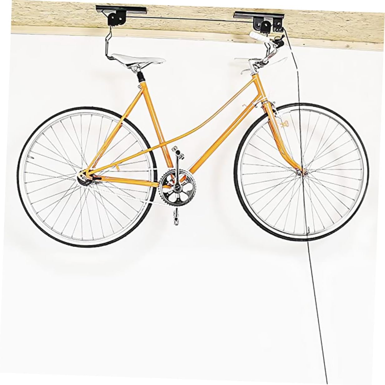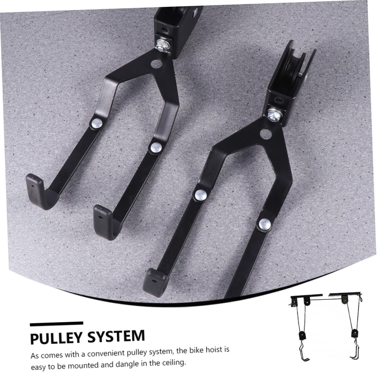 Package Include 1 screws 1 screw covers 1 set x bike ceiling rack 1 x 15m rope Features -Product Info:Wall rackGoods InformationIndoor Bike Hoists Features - Color: Black.Rack 11x4.Bike Wall Stand Holder 22x5.Bike Ceiling Mount - Our hooks greatly protect your bikes from scratches.Bike Ceiling Rack Just the hooks under your seat and handlebars and use the heavy duty rope to safely lift your bike.Hanger - This hanging rack can not only ’s cycle or your mountain bicycle, but also kayaks, extension ladders, and other gears as well.Bike Wall Hook 13inch.Bike Hanger - Keeping them out of the way when not being used, yet quickly and easily accessible when you want to go for a ride.Indoor Bike Storage Rack - The bike pulley hanging system allows lifting bike or road.Wall Mounted Bike Hanger This is dangerous and difficult for many people, but our smooth pulleys and easy to use hooks and latches make lifting and storing bikes easy and trouble free.Hanging Rack With ordinary hooks, you need to lift your bike over you head.Ceiling Hook - Material: Steel.Bike Hoists - The design of locking mechanism prevents accidental release. 5cm / 10. - Size: 26x13x10