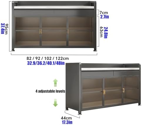 Introducing the JKGHK Kitchen Baker's Rack, a versatile and stylish solution for your storage needs. Designed with a spacious countertop and convenient drawers, this kitchen essential maximizes your organization while complementing your home décor. The screwless assembly allows for effortless setup, making it ideal for anyone to assemble, regardless of experience. Featuring 3C tempered glass cabinet doors, this rack stands out for its impressive impact and scratch resistance, ensuring long-lasting beauty and functionality. The reinforced shelves are designed to bear weight without bending or deforming, providing you with the durability you can rely on for all your kitchen essentials. Safety is a priority, with raised railings that offer three-sided protection to prevent items from falling. The 6cm raised feet allow for easy cleaning, making it simple to keep your space tidy and welcoming. Perfect for a variety of settings, this multipurpose baker's rack serves as a kitchen buffet, dining room sideboard, living room coffee bar, or entryway cabinet. Its sleek metal design in gray or white fits seamlessly into any home aesthetic. Dimensions are available in 82/92/102/122x44x95cm, providing options to suit your space requirements. Please note, due to handcrafted processing, there may be a slight variation of 1-2 cm in the final product size. Additionally, colors may vary slightly due to lighting and screen settings. Elevate your home organization with the JKGHK Kitchen Baker's Rack, where style meets practicality.