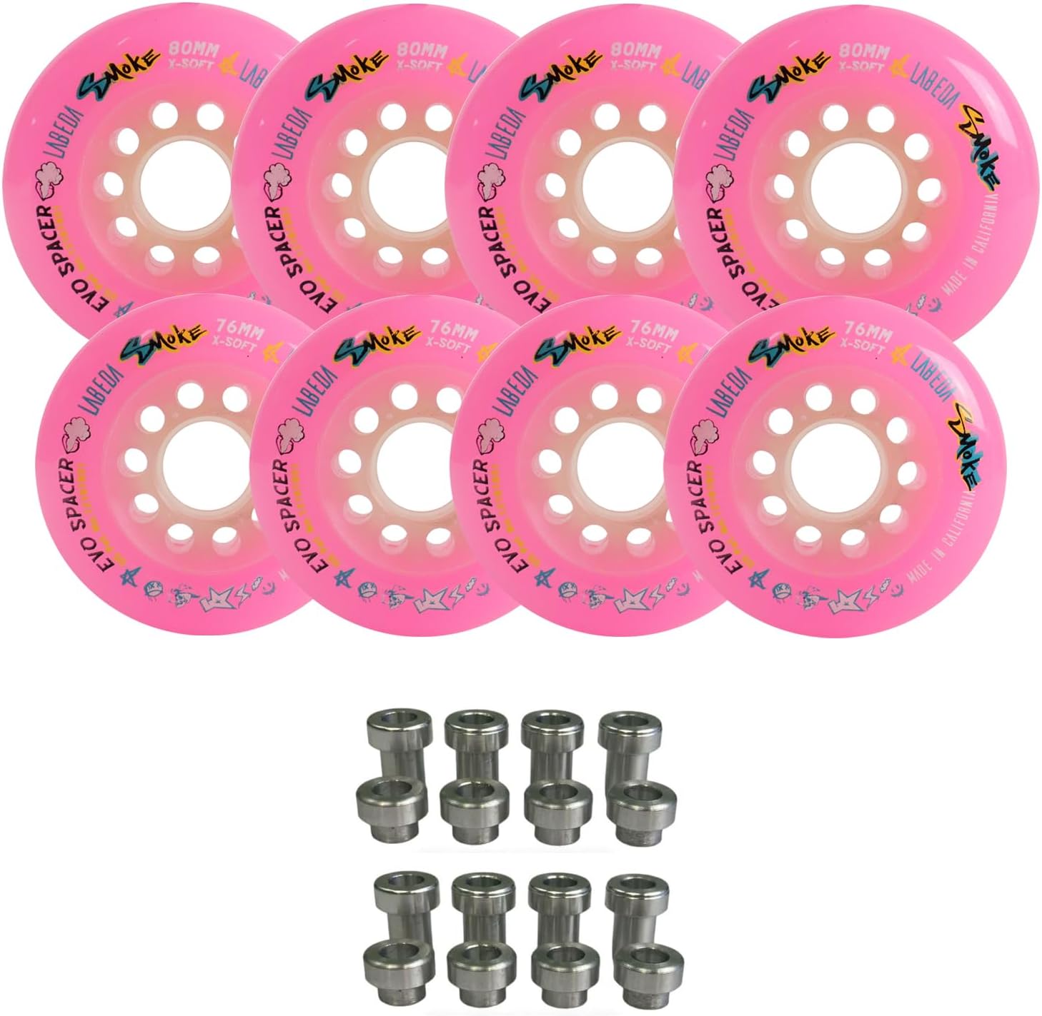 Labeda Smoke Wheels require a specific spacer – if you do not have the spacers, the wheels will not work. Not to worry, this listing includes enough EVO spacers to get you rolling. The EVO spacers only work with standard 6mm axles.The Smoke hasn’t cleared; it’s arrived! The Smoke is the newest addition to the Labeda family of EVO cored wheels. This patented system is trickling down to a streamlined version of the Whip wheel. Our patented free-spin spacer system, with the snap back EVO core, is ready to react to your every move. When games are decided on split second opportunities, don’t settle on performance, you want this Smoke!IDEAL PLAYING SURFACE: StilMat, Sport Court, Plastic Tile. WEIGHT GUIDELINES: Recommended for all players. Do not use on abrasive surfaces like concrete.Hardness is a general guideline to direct a player to a wheel based on the player’s weight and skating ability level. A player may choose a wheel designed for a heavier, or a lighter weight skater. This will allow the player to boost and maximize their grip and/or rolling skate speed. If they have advanced skating skills to compress the wheel enough to grip, or are looking for softer wheels to maximize grip on skating surfaces. Choosing to do either, may cause extended or premature wear.Includes 8 Smoke Evo Wheels with EVO spacers included. Mix and Match to make a full set.