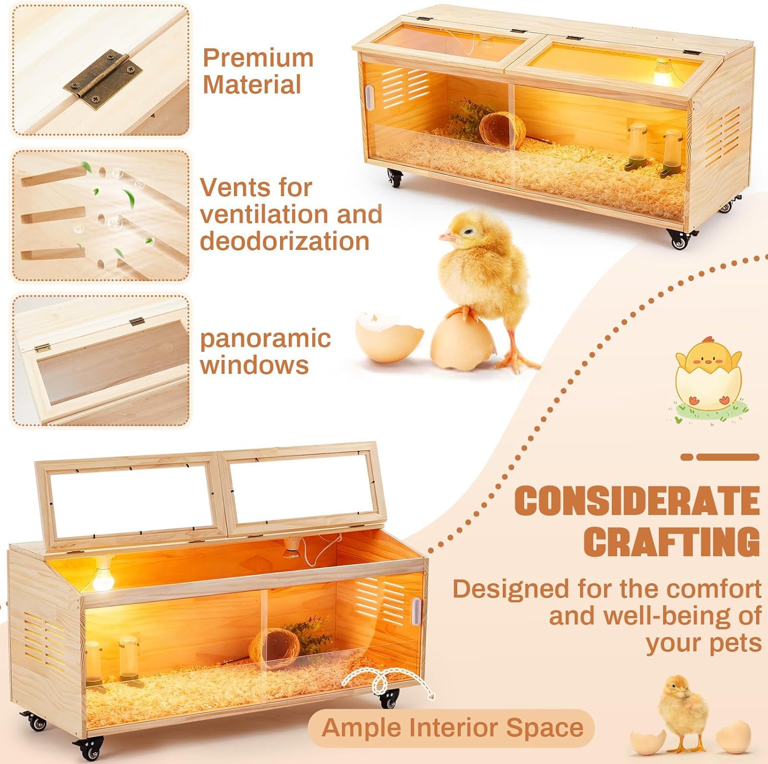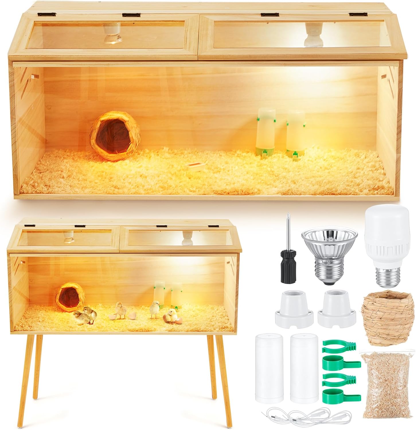 Features: A mobile habitat with a complete accessory kit, designed for easy cleaning and clear observation. Features a spacious interior with thoughtful ventilation and helpful assembly tips for various small pets. Specifications: Material: wood Color: Natural wood color Size: 39.37 x 15.75 x 15.75 inch/ 100 x 40 x 40 cm Package includes: 1 x Brooder box for chicks Notes: Manual measurement, please allow slight errors on size. The color may exist a slight difference due to different screen displays. Small items are included, please keep them away from pets in case of choking risk. Before purchase, confirm whether the product size is suitable for your pet, and observe the pet's reaction when using. Please remove the product in time if there is any discomfort